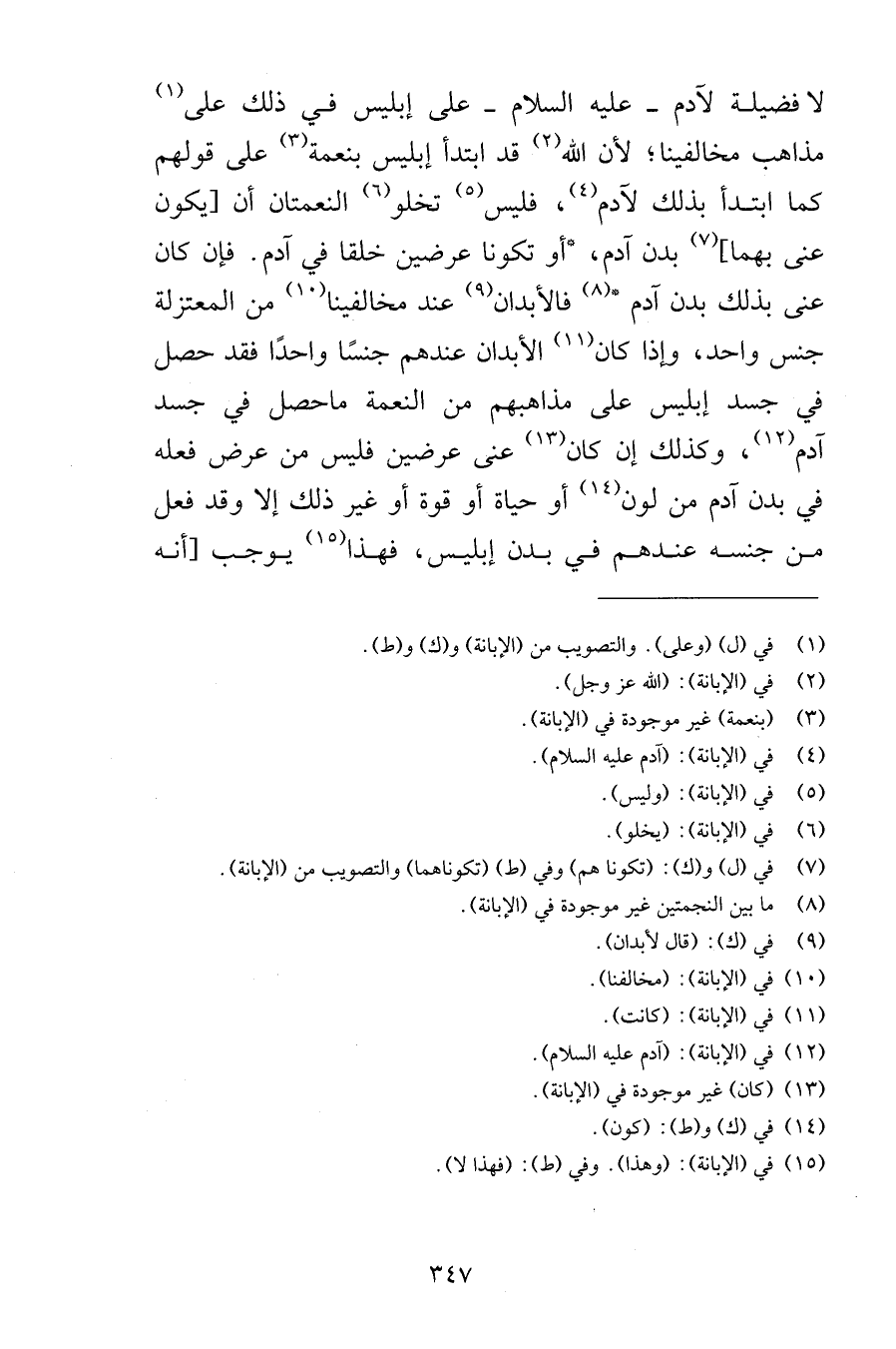 لا فضيلة لآدم عليه السلام على إبليس في ذلك على مذاهب مخالفينا لأن الله قد ابتدأ إبليس بنعمة على قولهم كما ابتدأ بذلك لآدم فليس تخلو النعمتان أن يكون عنى بهما بدن آدم أو تكونا عرضين خلقا في آدم فإن عنى بذلك بدن آدم فالأبدان عند مخالفينا من المعتزلة جنس واحد وإذا كان الأبدان عندهم جنسًا واحدًا فقد حصل في جسد إبليس على مذاهبهم من النعمة ماحصل في جسد آدم وكذلك إن كان عنى عرضين فليس من عرض فعله في بدن آدم من لون أو حياة أو قوة أو غير ذلك إلا وقد فعل من جنسه عندهم في بدن إبليس فهذا يوجب أنه