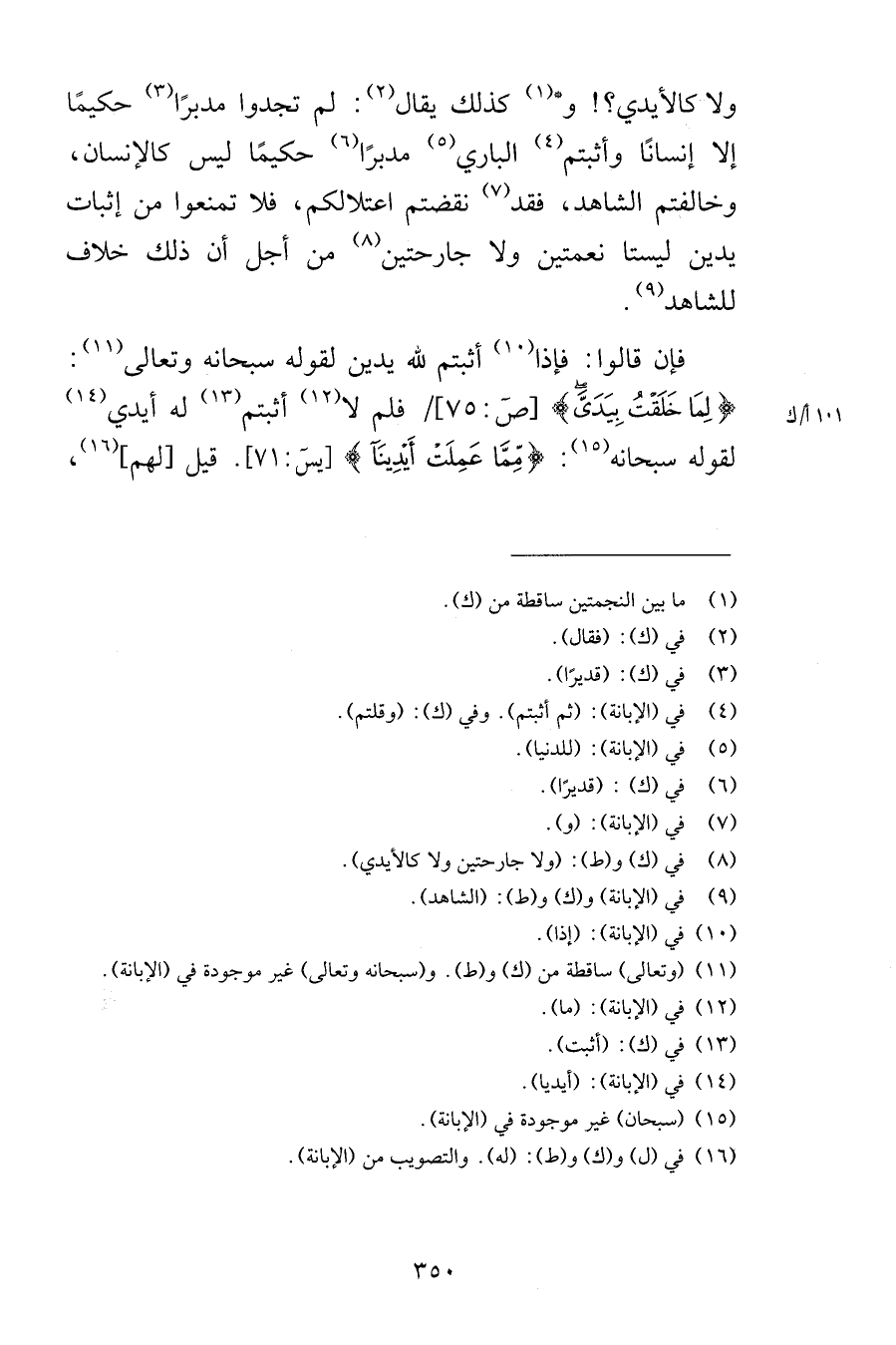 ولا كالأيدي وكذلك يقال لم تجدوا مدبرًا حكيمًا إلا إنسانًا وأثبتم الباري مدبرًا حكيمًا ليس كالإنسان وخالفتم الشاهد فقد نقضتم اعتلالكم فلا تمنعوا من إثبات يدين ليستا نعمتين ولا جارحتين من أجل أن ذلك خلاف للشاهد فإن قالوا فإذا أثبتم لله يدين لقوله سبحانه وتعالى لِمَا خَلَقْتُ بِيَدَيَّ [ص 75] فلم لا أثبتم له أيدي لقوله سبحانه مِمَّا عَمِلَتْ أَيْدِينَا [يس 71] قيل لهم