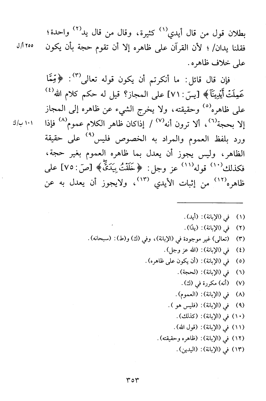 بطلان قول من قال أيدي كثيرة وقال من قال يد واحدة فقلنا يدان لأن القرآن على ظاهره إلا أن تقوم حجة بأن يكون على خلاف ظاهره فإن قال قائل ما أنكرتم أن يكون قوله تعالى مِمَّا عَمِلَتْ أَيْدِينَا [يس 71] على المجاز قيل له حكم كلام الله على ظاهره وحقيقته ولا يخرج الشيء عن ظاهره إلى المجاز إلا بحجة ألا ترون أنه إذاكان ظاهر كلام عموم فإذا ورد بلفظ العموم والمراد به الخصوص فليس على حقيقة الظاهر وليس يجوز أن يعدل بما ظاهره العموم بغير حجة فكذلك قوله عز وجل خَلَقْتُ بِيَدَيَّ [ص 75] على ظاهره من إثبات الأيدي ولايجوز أن يعدل به عن