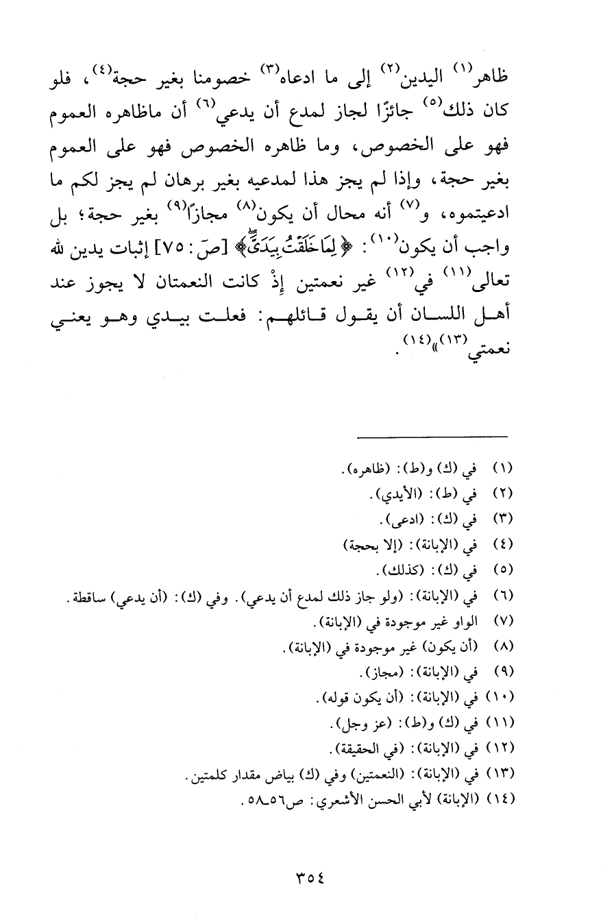 ظاهر اليدين إلى ما ادعاه خصومنا بغير حجة فلو كان ذلك جائزًا لجاز مدع أن يدعي أن ماظاهره العموم فهو على الخصوص وما ظاهره الخصوص فهو على العموم بغير حجة وإذا لم يجز هذا لمدعيه بغير برهان لم يجز لكم ما ادعيتموه وأنه محال أن يكون مجازًا بغير حجة بل واجب أن يكون لِمَا خَلَقْتُ بِيَدَيَّ [ص 75] إثبات يدين لله تعالى في غير نعمتين إذْ كانت النعمتان لا يجوز عند أهل اللسان أن يقول قائلهم فعلت بيدي وهو يعني نعمتي
