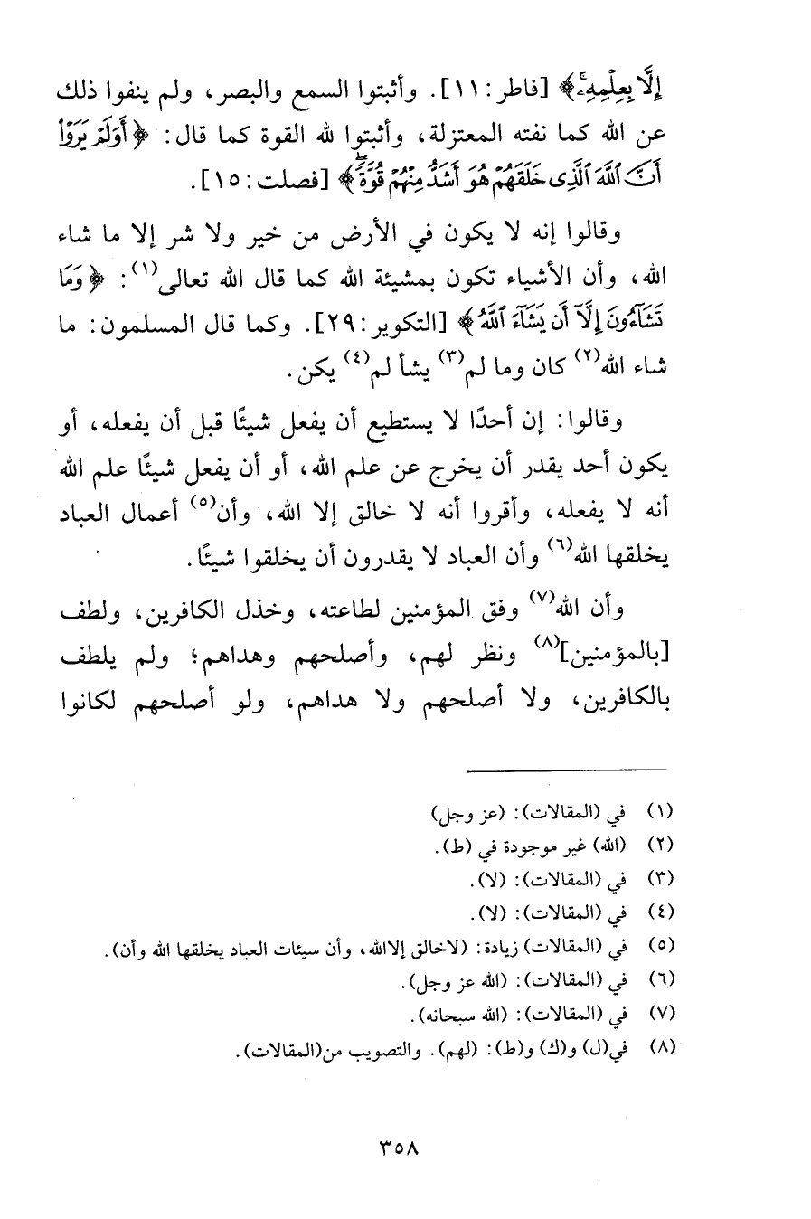 إِلَّا بِعِلْمِهِ [فاطر 11] وأثبتوا السمع والبصر ولم ينفوا ذلك عن الله كما نفته المعتزلة وأثبتوا لله القوة كما قال أَوَلَمْ يَرَوْا أَنَّ اللَّهَ الَّذِي خَلَقَهُمْ هُوَ أَشَدُّ مِنْهُمْ قُوَّةً [فصلت 15] وقالوا إنه لا يكون في الأرض من خير ولا شر إلا ما شاء الله وأن الأشياء تكون بمشيئة الله كما قال الله تعالى وَمَا تَشَاؤُونَ إِلَّا أَن يَشَاءَ اللَّهُ [التكوير 29] وكما قال المسلمون ما شاء الله كان وما لم يشأ لم يكن وقالوا إن أحدًا لا يستطيع أن يفعل شيئًا قبل أن يفعله أو يكون أحد يقدر أن يخرج عن علم الله أو أن يفعل شيئًا علم الله أنه لا يفعله وأقروا أنه لا خالق إلا الله وأن أعمال العباد يخلقها الله وأن العباد لا يقدرون أن يخلقوا شيئًا وأن الله وفق المؤمنين لطاعته وخذل الكافرين ولطف بالمؤمنين ونظر لهم وأصلحهم وهداهم ولم يلطف بالكافرين ولا أصلحهم ولا هداهم ولو أصلحهم لكانوا