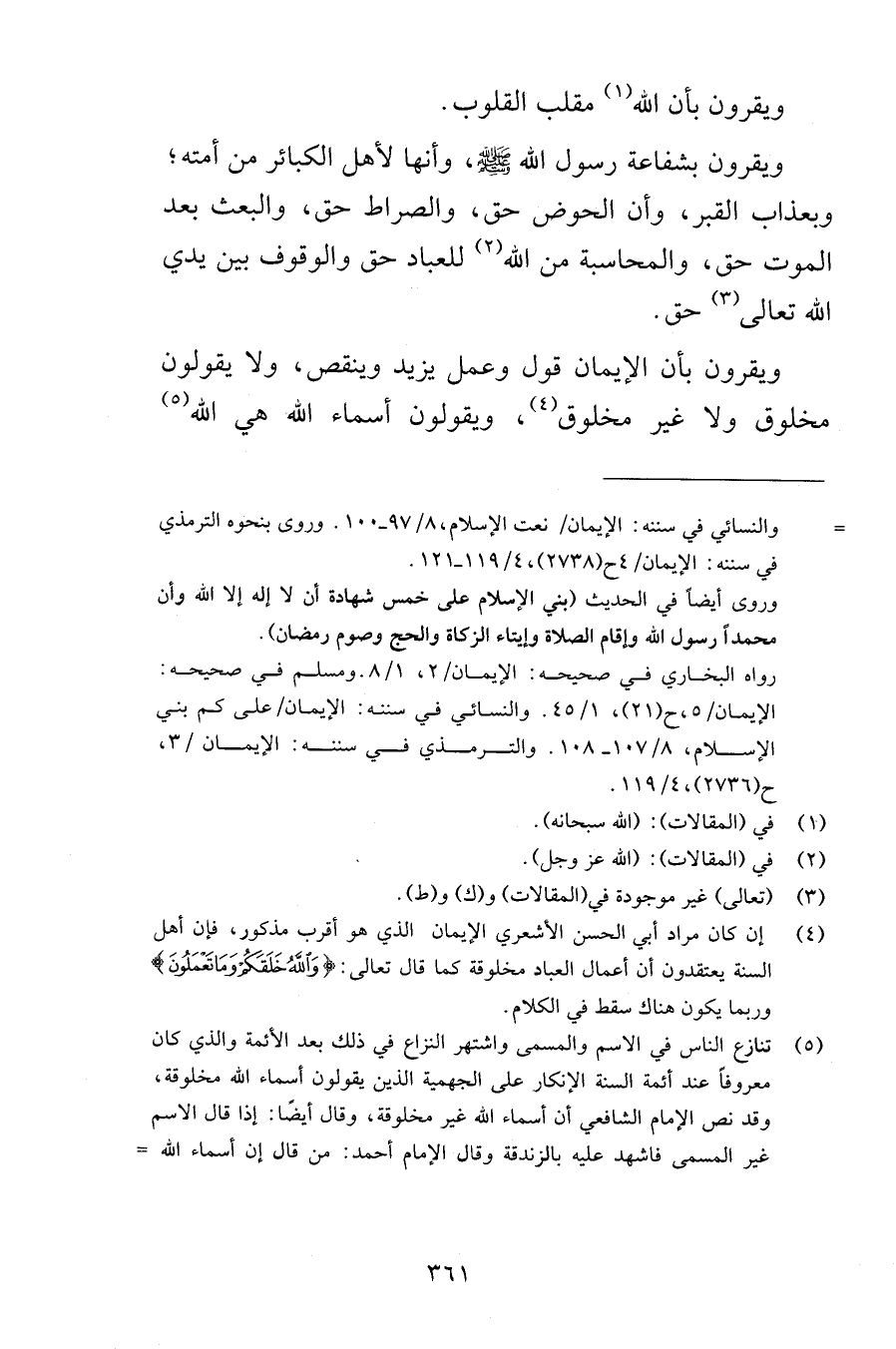 ويقرون بأن الله مقلب القلوب ويقرون بشفاعة رسول الله صلى الله عليه وسلم وأنها لأهل الكبائر من أمته وبعذاب القبر وأن الحوض حق والصراط حق والبعث بعد الموت حق والمحاسبة من الله للعباد حق والوقوف بين يدي الله تعالى حق ويقرون بأن الإيمان قول وعمل يزيد وينقص ولا يقولون مخلوق ولا غير مخلوق ويقولون أسماء الله هي الله