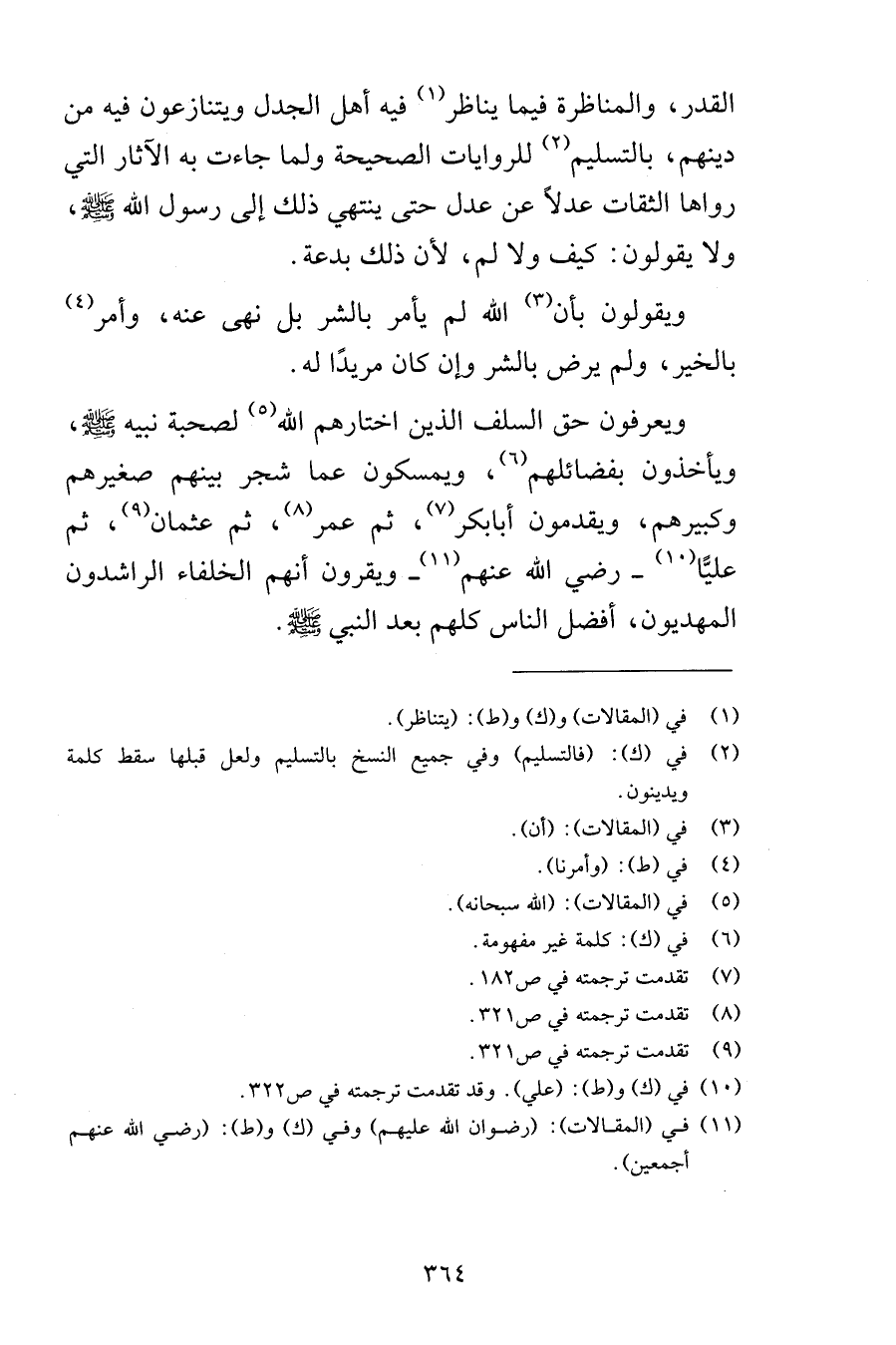 القدر والمناظرة فيما يناظر فيه أهل الجدل ويتنازعون فيه من دينهم بالتسليم للروايات الصحيحة ولما جاءت به الآثار التي رواها الثقات عدلاً عن عدل حتى ينتهي ذلك إلى رسول الله صلى الله عليه وسلم ولا يقولون كيف ولا لم لأن ذلك بدعة ويقولون بأن الله لم يأمر بالشر بل نهى عنه وأمر بالخير ولم يرض بالشر وإن كان مريدًا له ويعرفون حق السلف الذين اختارهم الله لصحبة نبيه صلى الله عليه وسلم ويأخذون بفضائلهم ويمسكون عما شجر بينهم صغيرهم وكبيرهم ويقدمون أبابكر ثم عمر ثم عثمان ثم عليًّا رضي الله عنهم ويقرون أنهم الخلفاء الراشدون المهديون أفضل الناس كلهم بعد النبي صلى الله عليه وسلم