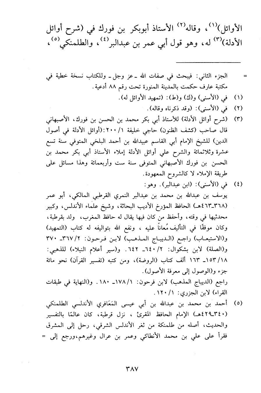 الأوائل وقاله الأستاذ أبوبكر بن فورك في شرح أوائل الأدلة له وهو قول أبي عمر بن عبد البر والطلمنكي