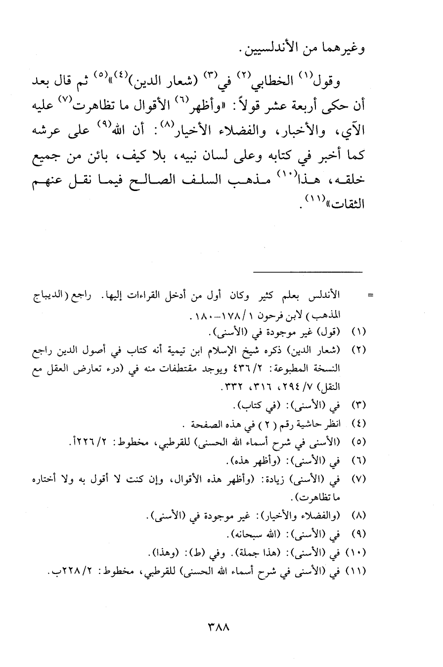 وغيرهما من الأندلسيين وقول الخطابي في شعار الدين ثم قال بعد أن حكى أربعة عشر قولاً وأظهر الأقوال ما تظاهرت عليه الآي والأخبار والفضلاء الأخيار أن الله على عرشه كما أخبر في كتابه وعلى لسان نبيه بلا كيف بائن من جميع خلقه هذا مذهب السلف الصالح فيما نقل عنهم الثقات