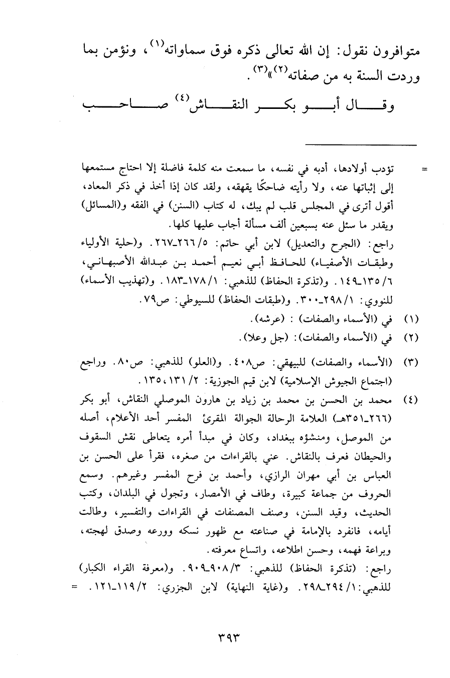 متوافرون نقول إن الله تعالى ذكره فوق سماواته ونؤمن بما وردت السنة به من صفاته وقال أبو بكر النقاش صاحب