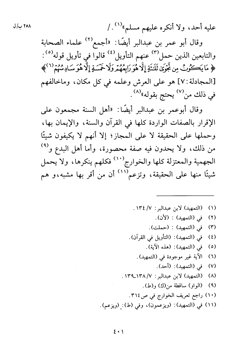 عليه أحد ولا أنكره عليهم مسلم وقال أبو عمر بن عبد البر أيضًا أجمع علماء الصحابة والتابعين الذين حمل عنهم التأويل قالوا في تأويل قوله مَا يَكُونُ مِن نَّجْوَى ثَلَاثَةٍ إِلَّا هُوَ رَابِعُهُمْ وَلَا خَمْسَةٍ إِلَّا هُوَ سَادِسُهُمْ [المجادلة 7] هو على العرش وعلمه في كل مكان وماخالفهم في ذلك من يحتج بقوله وقال أبو عمر بن عبد البر أيضًا أهل السنة مجمعون على الإقرار بالصفات الواردة كلها في القرآن والسنة والإيمان بها وحملها على الحقيقة لا على المجاز إلا أنهم لا يكيفون شيئًا من ذلك ولا يحدون فيه صفة محصورة وأما أهل البدع والجهمية والمعتزلة كلها والخوارج فكلهم ينكرها ولا يحمل شيئًا منها على الحقيقة وتزعم أن من أقر بها مشبه وهم