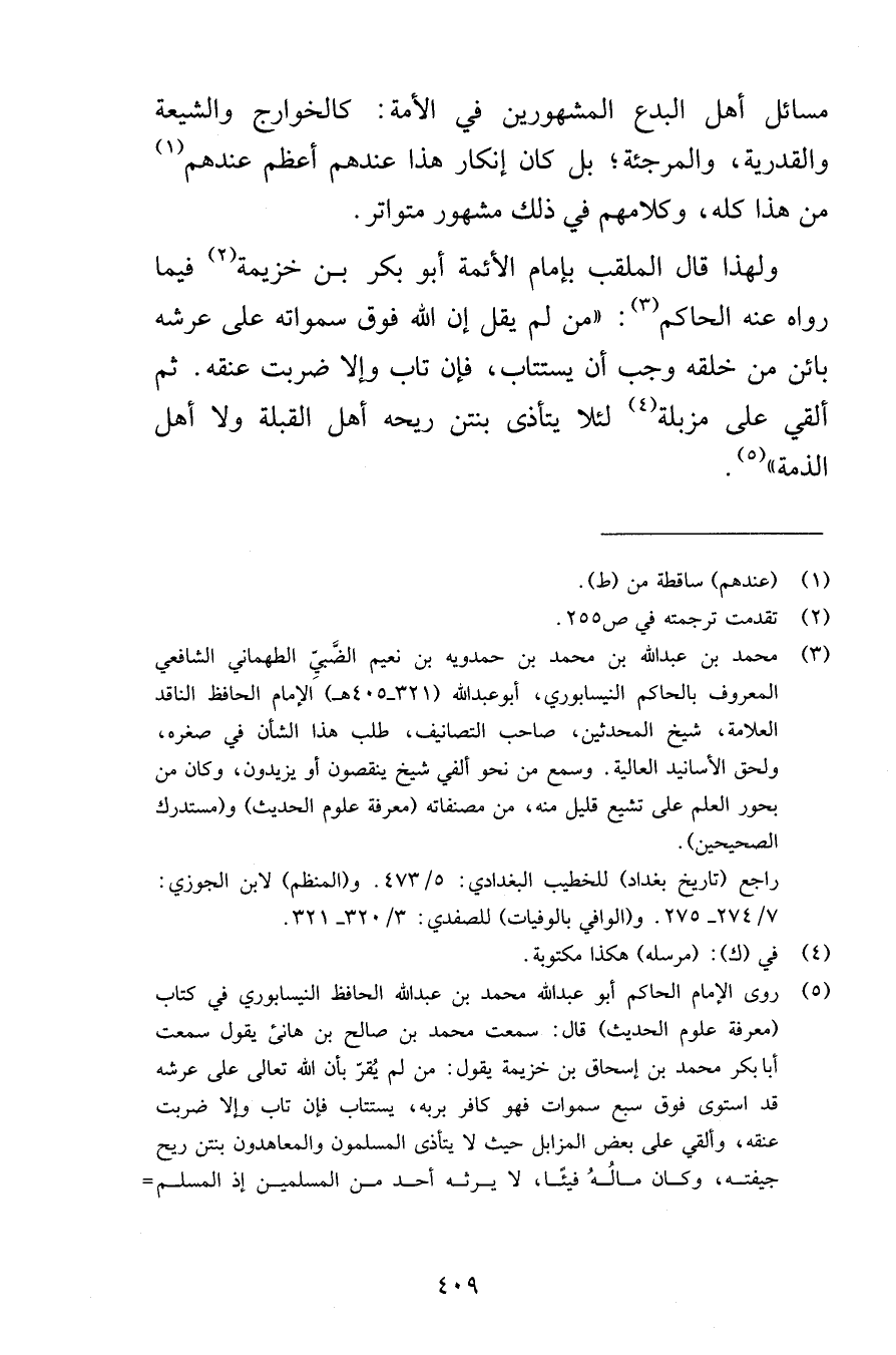 مسائل أهل البدع المشهورين في الأمة كالخوارج والشيعة والقدرية والمرجئة بل كان إنكار هذا عندهم أعظم عندهم من هذا كله وكلامهم في ذلك مشهور متواتر ولهذا قال الملقب بإمام الأئمة أبو بكر بن خزيمة فيما رواه عنه الحاكم من لم يقل إن الله فوق سمواته على عرشه بائن من خلقه وجب أن يستتاب فإن تاب وإلا ضربت عنقه ثم ألقي على مزبلة لئلا يتأذى بنتن ريحه أهل القبلة ولا أهل الذمة