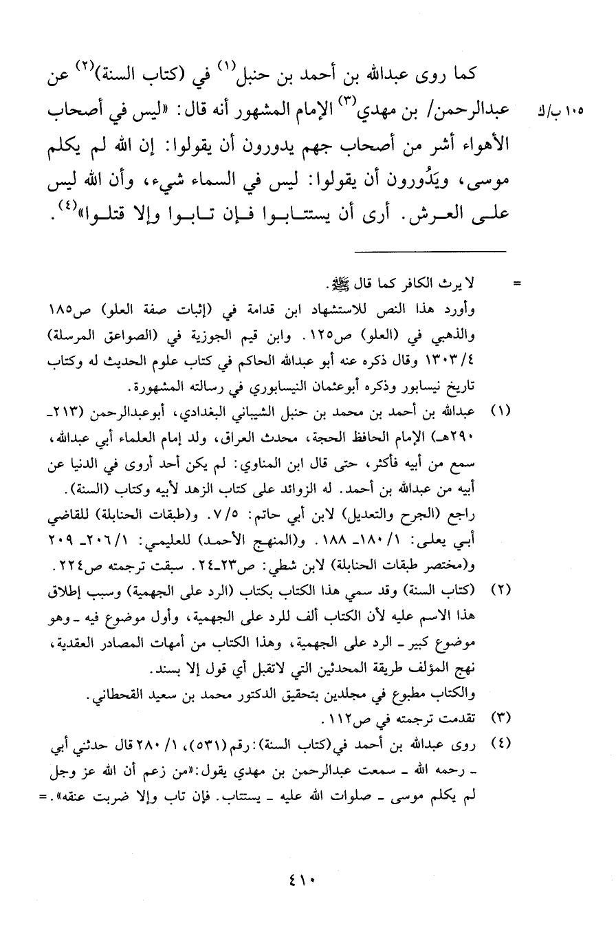 كما روى عبد الله بن أحمد بن حنبل في كتاب السنة عن عبد الرحمن بن مهدي الإمام المشهور أنه قال ليس في أصحاب الأهواء أشر من أصحاب جهم يدورون أن يقولوا إن الله لم يكلم موسى ويَدُورون أن يقولوا ليس في السماء شيء وأن الله ليس على العرش أرى أن يستتابوا فإن تابوا وإلا قتلوا