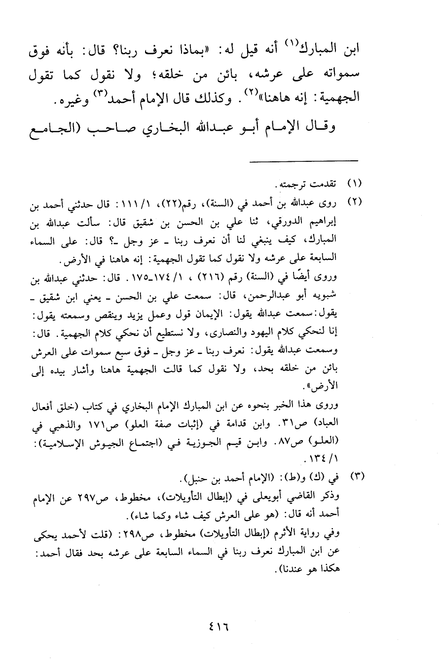 ابن المبارك أنه قيل له بماذا نعرف ربنا قال بأنه فوق سمواته على عرشه بائن من خلقه ولا نقول كما تقول الجهمية إنه هاهنا وكذلك قال الإمام أحمد وغيره وقال الإمام أبو عبد الله البخاري صاحب الجامع