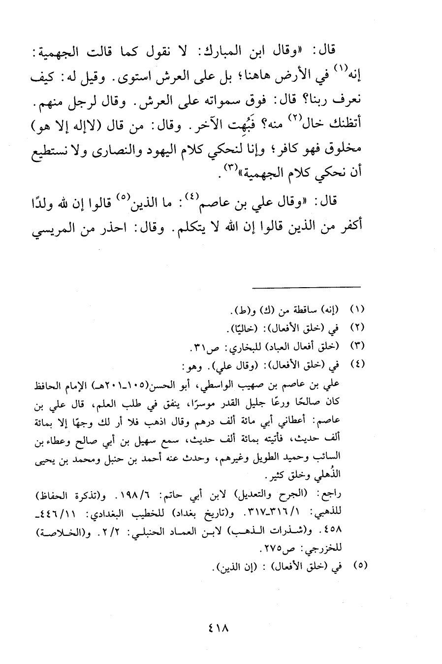قال وقال ابن المبارك لا نقول كما قالت الجهمية إنه في الأرض هاهنا بل على العرش استوى وقيل له كيف نعرف ربنا قال فوق سمواته على العرش وقال لرجل منهم أتظنك خال منه فَبُهِت الآخر وقال من قال لاإله إلا هو مخلوق فهو كافر وإنا لنحكي كلام اليهود والنصارى ولا نستطيع أن نحكي كلام الجهمية قال وقال علي بن عاصم ما الذين قالوا إن لله ولدًا أكفر من الذين قالوا إن الله لا يتكلم وقال احذر من المريسي