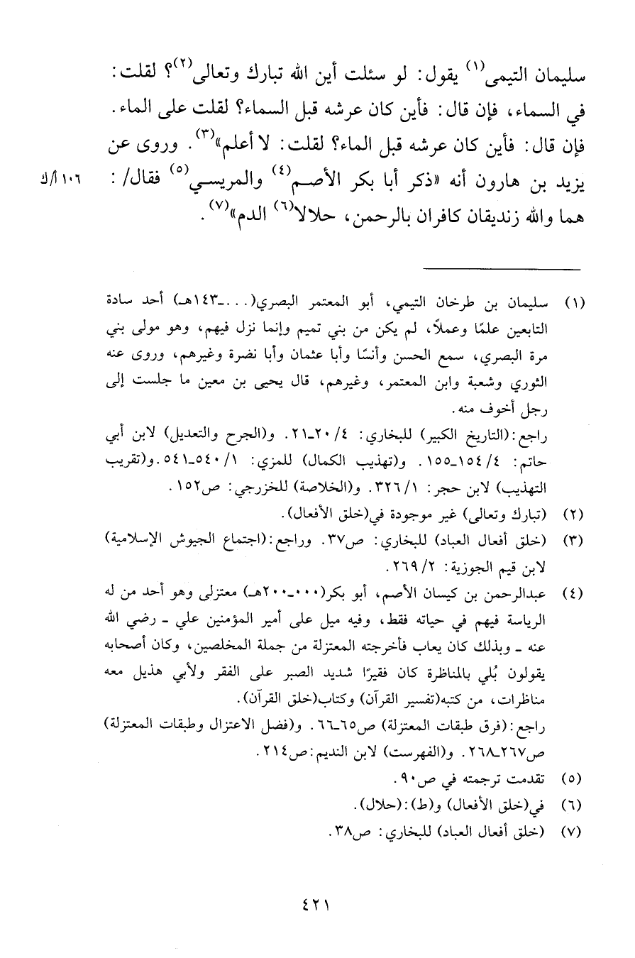 سليمان التيمى يقول لو سئلت أين الله تبارك وتعالى لقلت في السماء فإن قال فأين كان عرشه قبل السماء لقلت على الماء فإن قال فأين كان عرشه قبل الماء لقلت لا اعلم وروى عن يزيد بن هارون أنه ذكر أبا بكر الأصم والمريسي فقال هما والله زنديقان كافران بالرحمن حلالا الدم