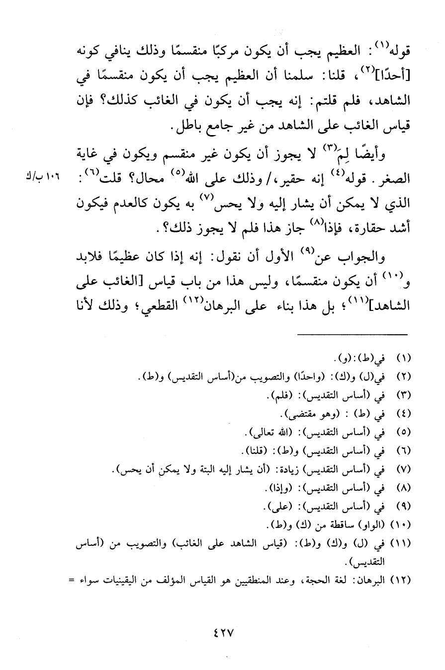 قوله العظيم يجب أن يكون مركبًا منقسمًا وذلك ينافي كونه أحدًا قلنا سلمنا أن العظيم يجب أن يكون منقسمًا في الشاهد فلم قلتم إنه يجب أن يكون في الغائب كذلك فإن قياس الغائب على الشاهد من غير جامع باطل وأيضًا لِمَ لا يجوز أن يكون غير منقسم ويكون في غاية الصغر قوله إنه حقير وذلك على الله محال قلت الذي لا يمكن أن يشار غليه ولا يحس به يكون كالعدم فيكون أشد حقارة فإذا جاز هذا فلم لا يجوز ذلك والجواب عن الأول أن نقول إنه إذا كان عظيمًا فلابد وأن يكون منقسمًا وليس هذا من باب قياس الغائب على الشاهد بل هذا بناء على البرهان القطعي وذلك لأنا