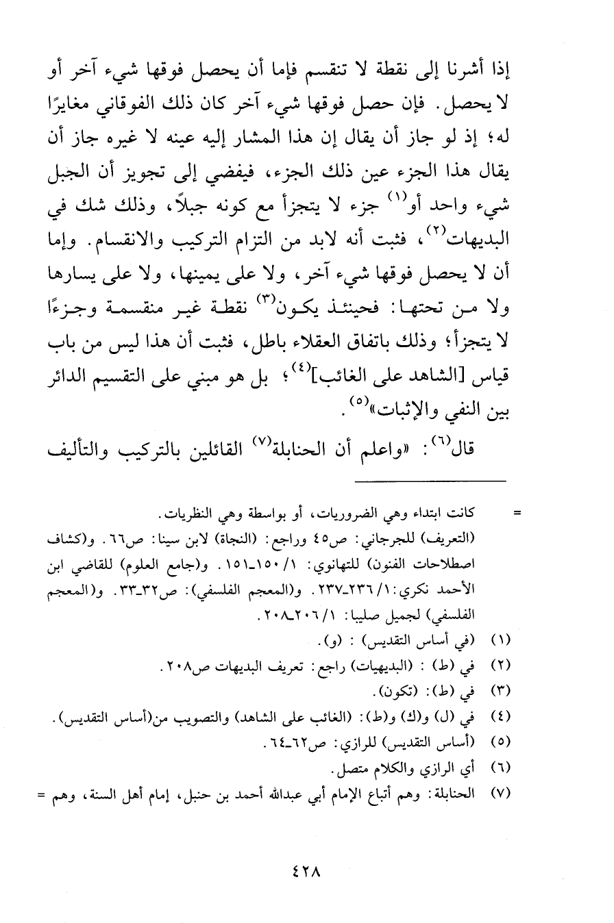 إذا أشرنا إلى نقطة لا تنقسم فإما أن يحصل فوقها شيء آخر أو لا يحصل فإن حصل فوقها شيء آخر كان ذلك الفوقاني مغايرًا له إذ لو جاز أن يقال إن هذا المشار إليه عينه لا غيره جاز أن يقال هذا الجزء عين ذلك الجزء فيفضي إلى تجويز أن الجبل شيء واحد أو جزء لا يتجزأ مع كونه جبلاً وذلك شك في البديهات فثبت أنه لابد من التزام التركيب والانقسام وإما أن لا يحصل فوقها شيء آخر ولا على يمينها ولا على يسارها ولا من تحتها فحينئذ يكون نقطة غير منقسمة وجزءًا لا يتجزأ وذلك باتفاق العقلاء باطل فثبت أن هذا ليس من باب قياس الشاهد على الغائب بل هو مبني على التقسيم الدائر بين النفي والإثبات قال واعلم أن الحنابلة القائلين بالتركيب والتأليف