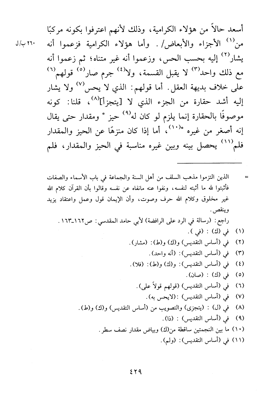أسعد حالاً من هؤلاء الكرامية وذلك لأنهم اعترفوا بكونه مركبًا من الأجزاء والأبعاض وأما هؤلاء الكرامية فزعموا أنه يشار إليه بحسب الحس وزعموا أنه غير متناه ثم زعموا أنه مع ذلك واحد لا يقبل القسمة ولا جرم صار قولهم على خلاف بديهة العقل أما قولهم الذي لا يحس ولا يشار إليه أشد حقارة من الجزء الذي لا يتجزأ قلنا كونه موصوفًا بالحقارة إنما يلزم لو كان له حيز ومقدار حتى يقال إنه أصغر من غيره أما إذا كان منزهًا عن الحيز والمقدار فلم يحصل بينه وبين غيره مناسبة في الحيز والمقدار فلم