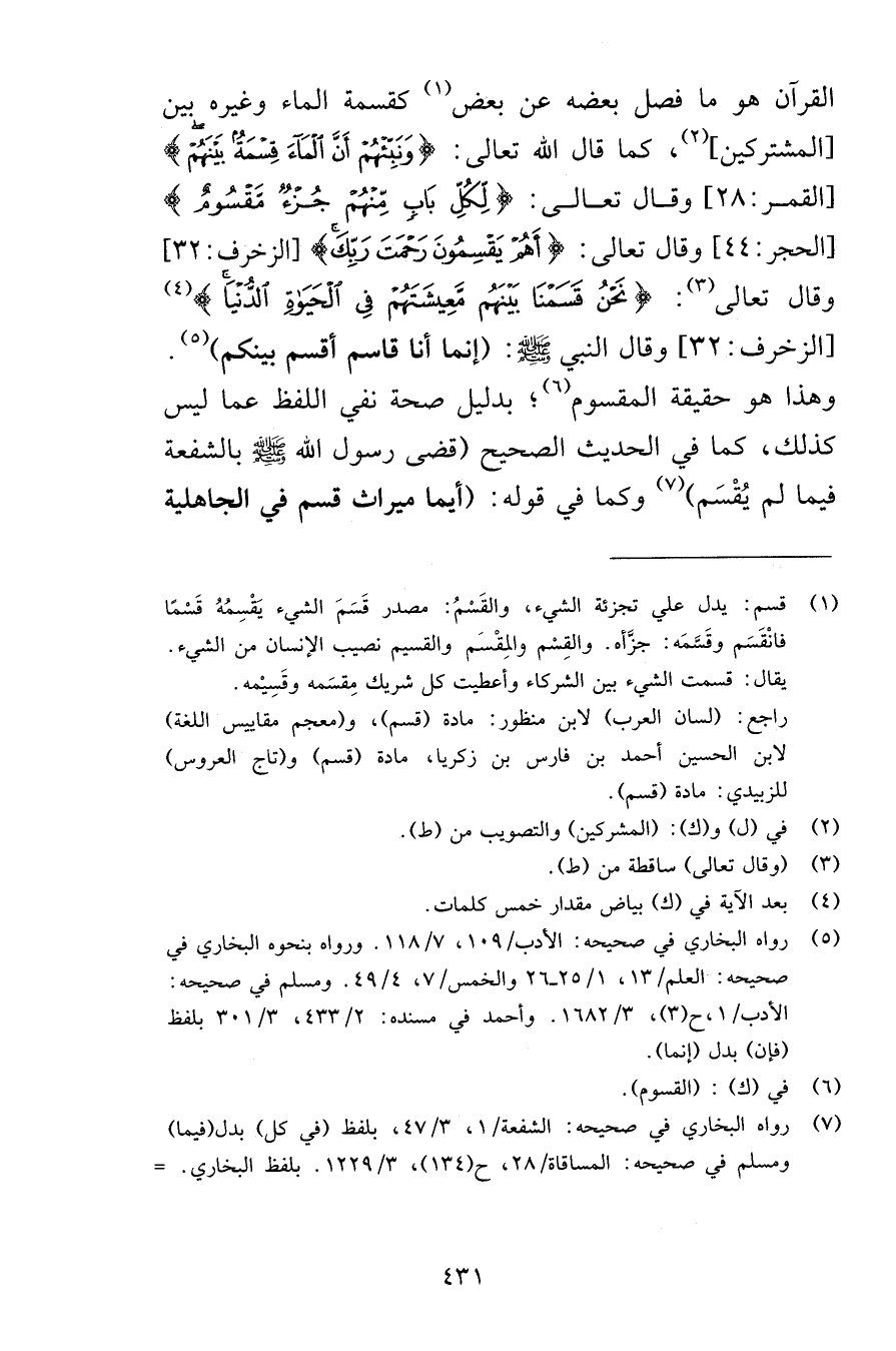 القرآن هو ما فصل بعضه عن بعض كقسمة الماء وغيره بين المشتركين كما قال الله تعالى وَنَبِّئْهُمْ أَنَّ الْمَاء قِسْمَةٌ بَيْنَهُمْ [القمر 28] وقال تعالى لِّكُلِّ بَابٍ مِّنْهُمْ جُزْءٌ مَّقْسُومٌ [الحجر 44] وقال تعالى أَهُمْ يَقْسِمُونَ رَحْمَةَ رَبِّكَ [الزخرف 32] وقال تعالى نَحْنُ قَسَمْنَا بَيْنَهُم مَّعِيشَتَهُمْ فِي الْحَيَاةِ الدُّنْيَا [الزخرف 32] وقال النبي صلى الله عليه وسلم إنما أنا قاسم أقسم بينكم وهذا هو حقيقة المقسوم بدليل صحة نفي اللفظ عما ليس كذلك كما في الحديث الصحيح قضى رسول الله صلى الله عليه وسلم بالشفعة فيما لم يُقْسَم وكما في قوله أيما ميراث قسم في الجاهلية
