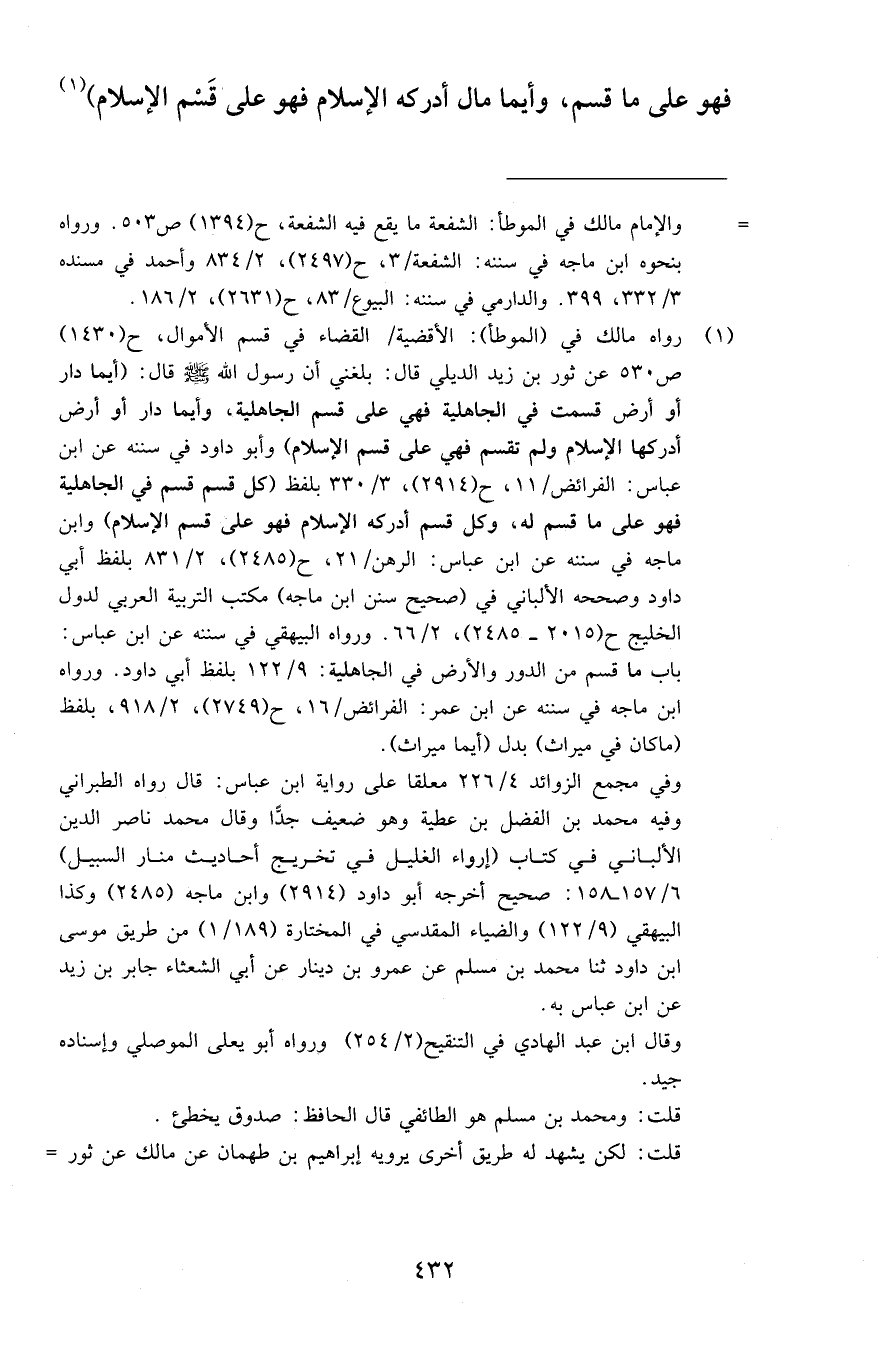 فهو على ما قسم وأيما مال أدركه الإسلام فهو على قَسْم الإسلام