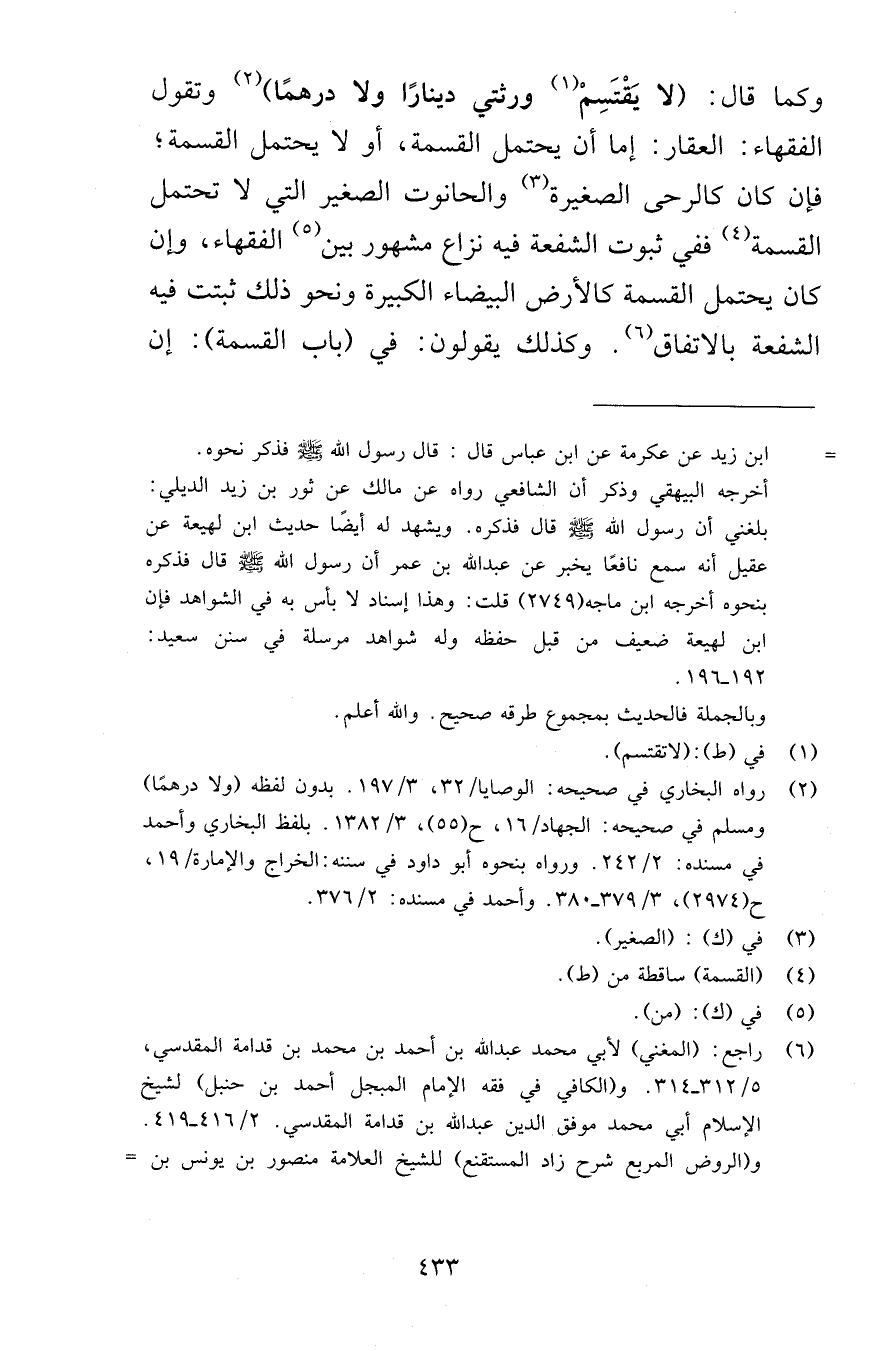 وكما قال لا يَقْتَسِمْ ورثتي دينارًا ولا درهمًا وتقول الفقهاء العقار إما أن يحتمل القسمة أو لا يحتمل القسمة فإن كان كالرحى الصغيرة والحانوت الصغير التي لا تحتمل القسمة ففي ثبوت الشفعة فيه نزاع مشهور بين الفقهاء وإن كان يحتمل القسمة كالأرض البيضاء الكبيرة ونحو ذلك ثبتت فيه الشفعة بالاتفاق وكذلك يقولون في باب القسمة إن