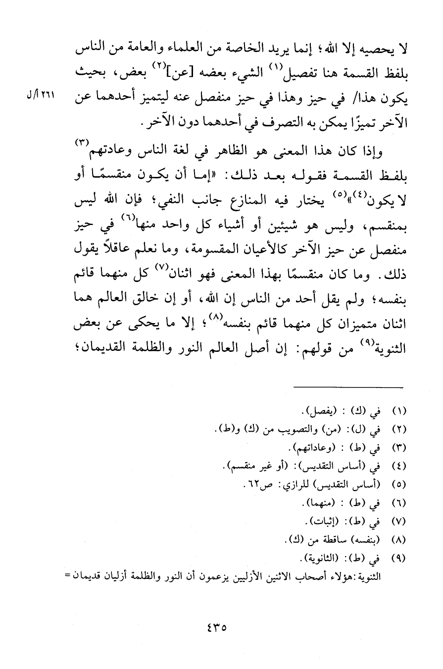 لا يحصيه إلا الله إنما يريد الخاصة من العلماء والعامة من الناس بلفظ القسمة هنا تفصيل الشيء بعضه عن بعض بحيث يكون هذا في حيز وهذا في حيز منفصل عنه ليتميز أحدهما عن الآخر تميزًا يمكن به التصرف في احدهما دون الآخر وإذا كان هذا المعنى هو الظاهر في لغة الناس وعادتهم بلفظ القسمة فقوله بعد ذلك إما أن يكون منقسمًا أو لا يكون يختار فيه المنازع جانب النفي فإن الله ليس بمنقسم وليس هو شيئين أو أشياء كل واحد منها في حيز منفصل عن حيز الآخر كالأعيان المقسومة وما نعلم عاقلاً يقول ذلك وما كان منقسمًا بهذا المعنى فهو اثنان كل منهما قائم بنفسه ولم يقل أحد من الناس إن الله أو إن خالق العالم هما اثنان متميزان كل منهما قائم بنفسه إلا ما يحكى عن بعض الثنوية من قولهم إن أصل العالم النور والظلمة القديمان