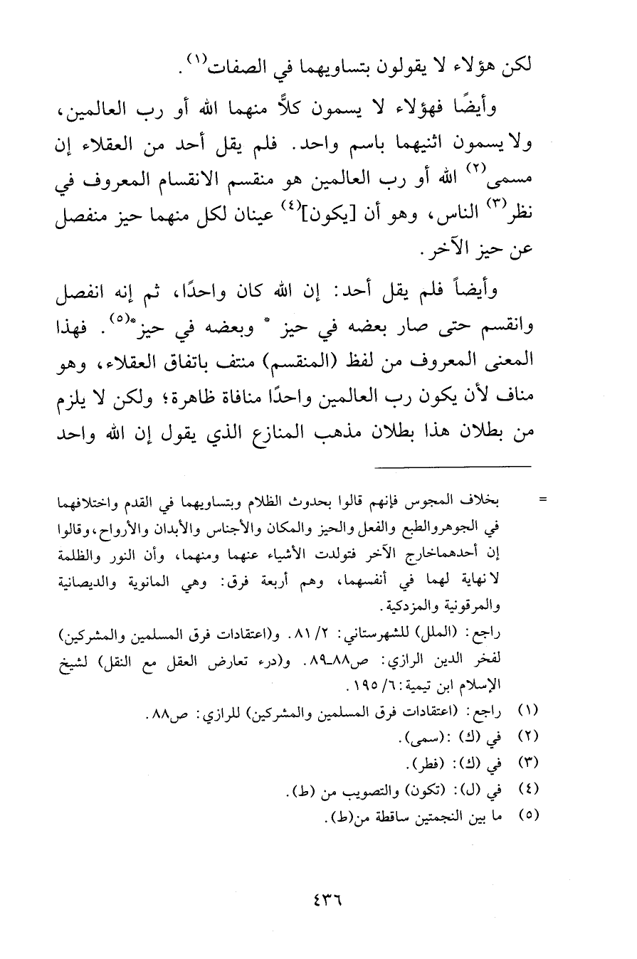 لكن هؤلاء لا يقولون بتساويهما في الصفات وأيضًا فهؤلاء لا يسمون كلاًّ منهما الله أو رب العالمين ولا يسمون اثنيهما باسم واحد فلم يقل أحد من العقلاء إن مسمى الله أو رب العالمين هو منقسم الانقسام المعروف في نظر الناس وهو أن يكون عينان لكل منهما حيز منفصل عن حيز الآخر وأيضًا فلم يقل أحد إن الله كان واحدًا ثم إنه انفصل وانقسم حتى صار بعضه في حيز وبعضه في حيز فهذا المعنى المعروف من لفظ المنقسم منتف باتفاق العقلاء وهو مناف لأن يكون رب العالمين واحدًا منافاة ظاهرة ولكن لا يلزم من بطلان هذا بطلان مذهب المنازع الذي يقول إن الله واحد
