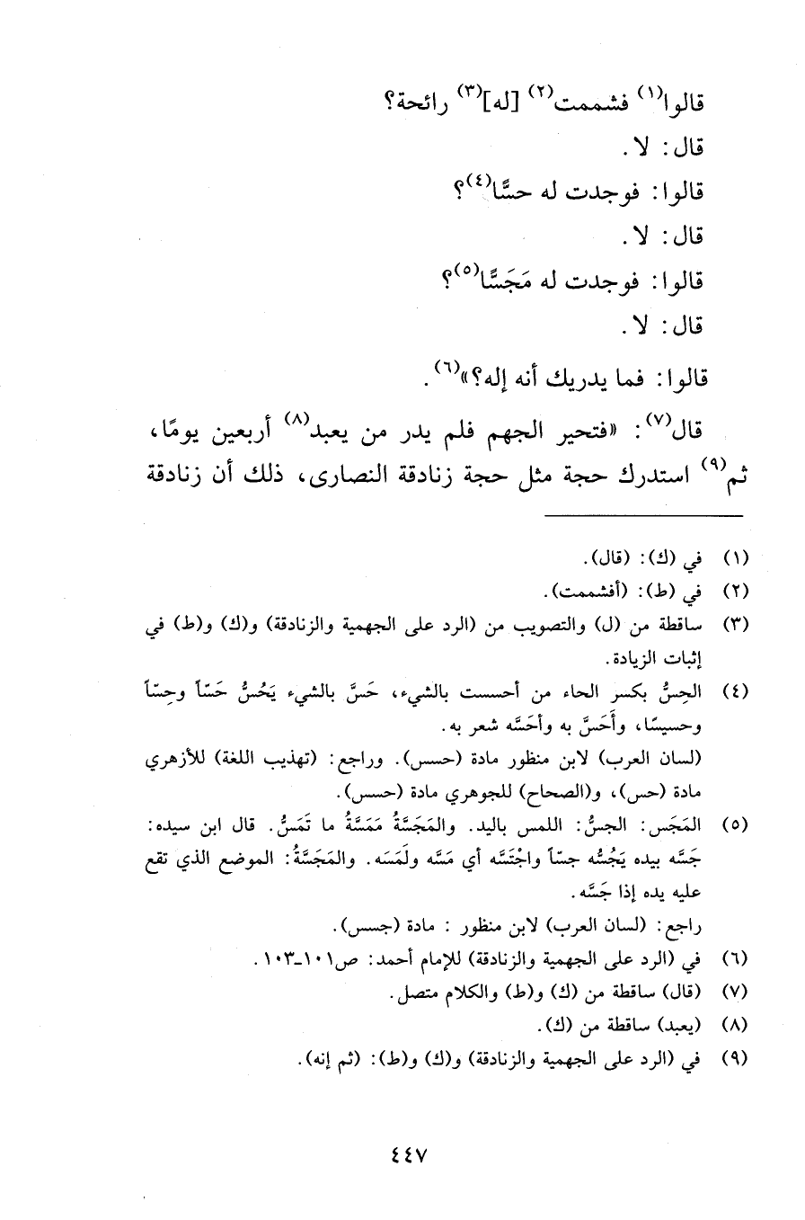 قالوا فشممت له رائحة قال لا قالوا فوجدت له حسًّا قال لا قالوا فوجدت له مَجَسًّا قال لا قالوا فما يدريك أنه إله قال فتحير الجهم فلم يدر من يعبد أربعين يومًا ثم استدرك حجة مثل حجة زنادقة النصارى ذلك أن زنادقة