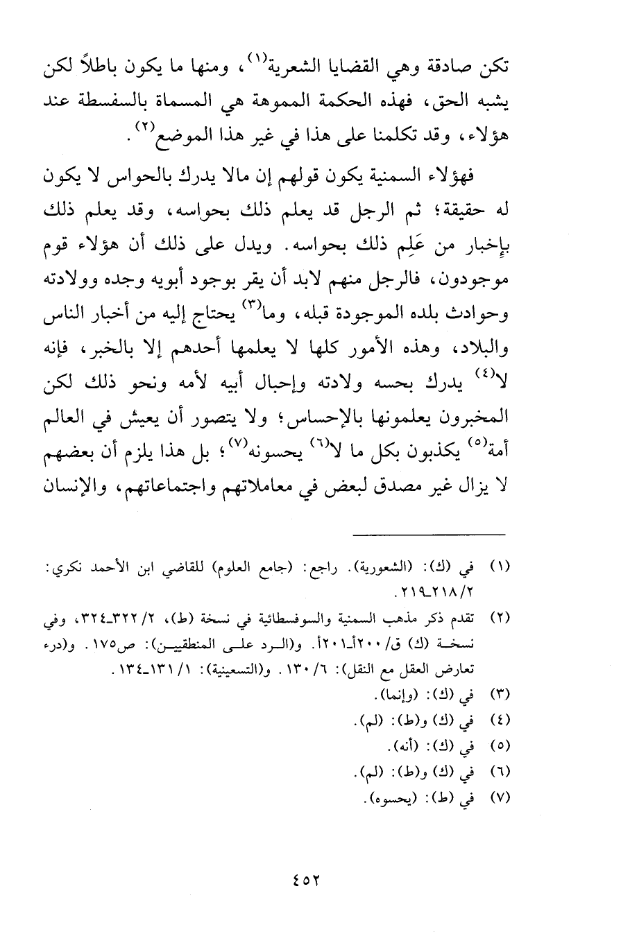 تكن صادقة وهي القضايا الشعرية ومنها ما يكون باطلاً لكن يشبه الحق فهذه الحكمة المموهة هي المسماة بالسفسطة عند هؤلاء وقد تكلمنا على هذا في غير هذا الموضع فهؤلاء السمنية يكون قولهم إن مالا يدرك بالحواس لا يكون له حقيقة ثم الرجل قد يعلم ذلك بحواسه وقد يعلم ذلك بإِخبار من عَلِم ذلك بحواسه ويدل على ذلك أن هؤلاء قوم موجودون فالرجل منهم لابد أن يقر بوجود أبويه وجده وولادته وحوادث بلده الموجودة قبله وما يحتاج إليه من أخبار الناس والبلاد وهذه الأمور كلها لا يعلمها أحدهم إلا بالخبر فإنه لا يدرك بحسه ولادته وإحبال أبيه لأمه ونحو ذلك لكن المخبرون يعلمونها بالإحساس ولا يتصور أن يعيش في العالم أمة يكذبون بكل ما لا يحسونه بل هذا يلزم أن بعضهم لا يزال غير مصدق لبعض في معاملاتهم واجتماعاتهم والإنسان