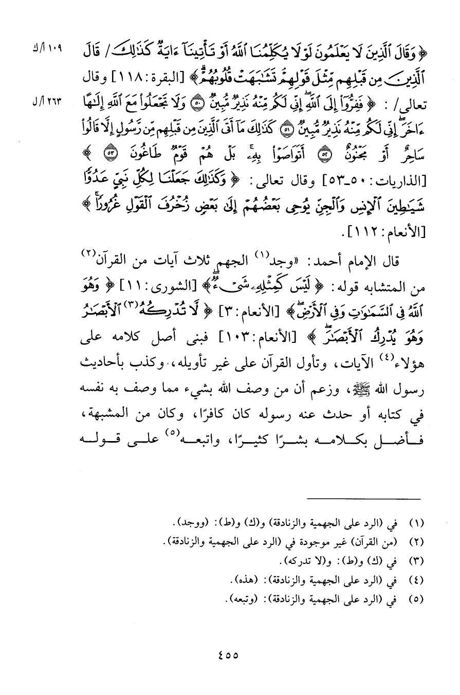 وَقَالَ الَّذِينَ لاَ يَعْلَمُونَ لَوْلاَ يُكَلِّمُنَا اللهُ أَوْ تَأْتِينَا آيَةٌ كَذَلِكَ قَالَ الَّذِينَ مِن قَبْلِهِم مِّثْلَ قَوْلِهِمْ تَشَابَهَتْ قُلُوبُهُمْ [البقرة 118] وقال تعالى فَفِرُّوا إِلَى اللَّهِ إِنِّي لَكُم مِّنْهُ نَذِيرٌ مُّبِينٌ {50} وَلَا تَجْعَلُوا مَعَ اللَّهِ إِلَهاً آخَرَ إِنِّي لَكُم مِّنْهُ نَذِيرٌ مُّبِينٌ {51} كَذَلِكَ مَا أَتَى الَّذِينَ مِن قَبْلِهِم مِّن رَّسُولٍ إِلَّا قَالُوا سَاحِرٌ أَوْ مَجْنُونٌ {52} أَتَوَاصَوْا بِهِ بَلْ هُمْ قَوْمٌ طَاغُونَ {53} [الذاريات 50-53] وقال تعالى وَكَذَلِكَ جَعَلْنَا لِكُلِّ نِبِيٍّ عَدُوّاً شَيَاطِينَ الإِنسِ وَالْجِنِّ يُوحِي بَعْضُهُمْ إِلَى بَعْضٍ زُخْرُفَ الْقَوْلِ غُرُوراً [الأنعام 112] قال الإمام أحمد وجد الجهم ثلاث آيات من القرآن من المتشابه قوله لَيْسَ كَمِثْلِهِ شَيْءٌ [الشورى 11] وَهُوَ اللهُ فِي السَّمَاوَاتِ وَفِي الأَرْضِ [الأنعام 3] لاَّ تُدْرِكُهُ الأَبْصَارُ وَهُوَ يُدْرِكُ الأَبْصَارَ [الأنعام 103] فبنى أصل كلامه على هؤلاء الآيات وتأول القرآن على غير تأويله وكذب بأحاديث رسول الله صلى الله عليه وسلم وزعم أن من وصف الله بشيء مما وصف به نفسه في كتابه أو حدث عنه رسوله كان كافرًا وكان من المشبهة فأضل بكلامه بشرًا كثيرًا واتبعه على قوله