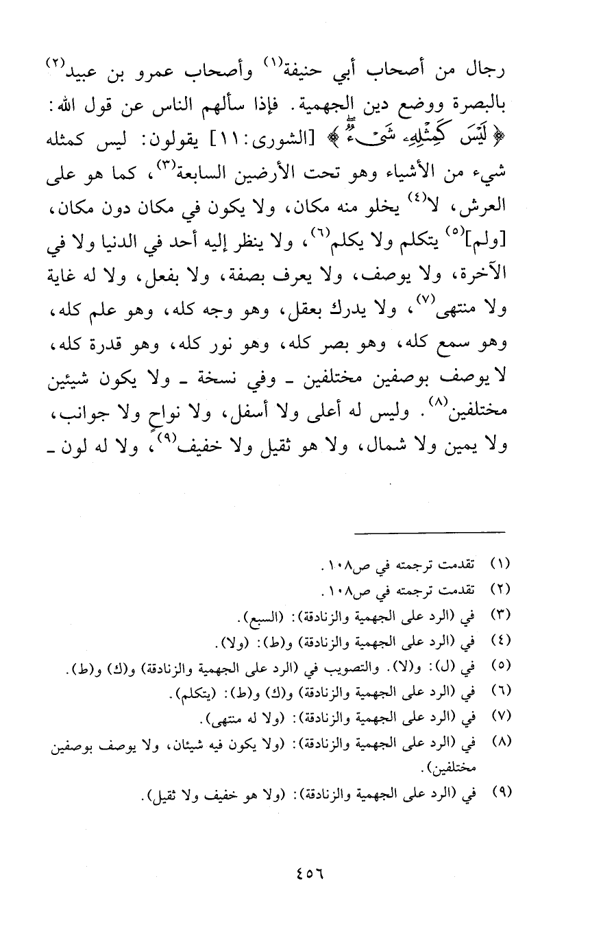 رجال من أصحاب أبي حنيفة وأصحاب عمرو بن عبيد بالبصرة ووضع دين الجهمية فإذا سألهم الناس عن قول الله لَيْسَ كَمِثْلِهِ شَيْءٌ [الشورى 11] يقولون ليس كمثله شيء من الأشياء وهو تحت الأرضين السابعة كما هو على العرش لا يخلو منه مكان ولا يكون في مكان دون مكان ولم يتكلم ولا يكلم ولا ينظر إليه أحد في الدنيا ولا في الآخرة ولا يوصف ولا يعرف بصفة ولا بفعل ولا له غاية ولا منتهى ولا يدرك بعقل وهو وجه كله وهو علم كله وهو سمع كله وهو بصر كله وهو نور كله وهو قدرة كله لا يوصف بوصفين مختلفين وفي نسخة لا يكون شيئين مختلفين وليس له أعلى ولا أسفل ولا نواحٍ ولا جوانب ولا يمين ولا شمال ولا هو ثقيل ولا خفيف ولا له لون