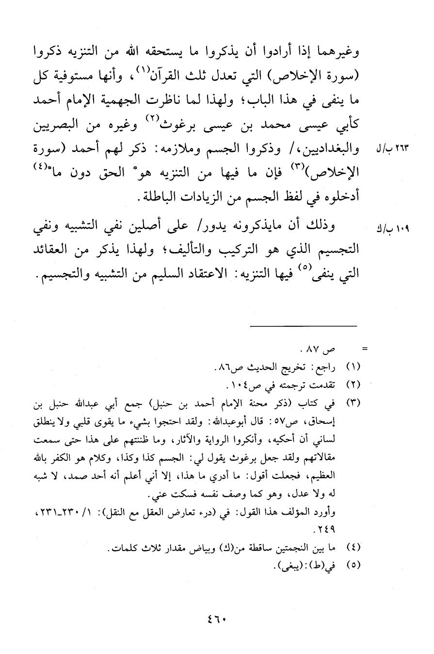 وغيرهما إذا أرادوا أن يذكروا ما يستحقه الله من التنزيه ذكروا سورة الإخلاص التي تعدل ثلث القرآن وأنها مستوفية كل ما ينفى في هذا الباب ولهذا لما ناظرت الجهمية الإمام أحمد كأبي عيسى محمد بن عيسى برغوث وغيره من البصريين والبغداديين وذكروا الجسم وملازمه ذكر لهم أحمد سورة الإخلاص فإن ما فيها من التنزيه هو الحق دون ما ادخلوه في لفظ الجسم من الزيادات الباطلة وذلك أن مايذكرونه يدور على أصلين نفي التشبيه ونفي التجسيم الذي هو التركيب والتأليف ولهذا يذكر من العقائد التي ينفى فيها التنزيه الاعتقاد السليم من التشبيه والتجسيم
