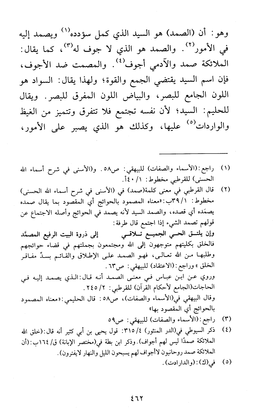 وهو أن الصمد هو السيد الذي كمل سؤدده ويصمد إليه في الأمور والصمد هو الذي لا جوف له كما يقال الملائكة صمد والآدمي أجوف والمصمت ضد الأجوف فإن اسم السيد يقتضي الجمع والقوة ولهذا يقال السواد هو اللون الجامع للبصر والبياض اللون المفرق للبصر ويقال للحليم السيد لأن نفسه تجتمع فلا تتفرق ولا تتميز من الغيظ والواردات عليها وكذلك هو الذي يصبر على الأمور