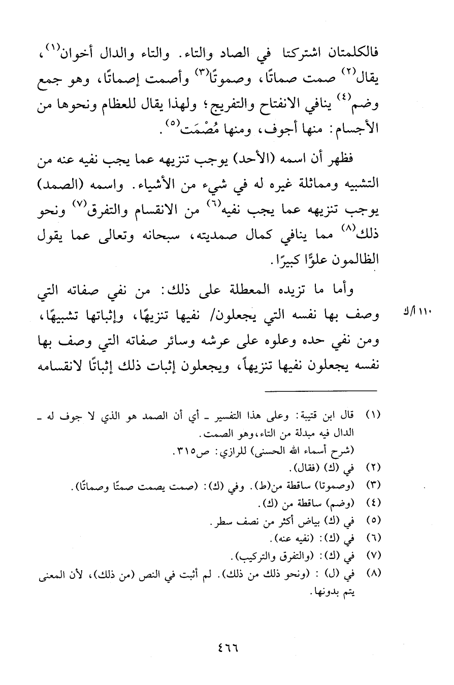 فالكلمتان اشتركتا في الصاد والتاء والتاء والدال أخوان يقال صمت صماتًا وصموتًا وأصمت وإصماتًا وهو جمع وضم ينافي الانفتاح والتفريج ولهذا يقال للعظام ونحوها من الأجسام منها أجوف ومنها مُصْمَت فظهر أن اسم الأحد يوجب تنزيهه عما يجب نفيه عنه من التشبيه ومماثلة غيره له في شيء من الأشياء واسمه الصمد يوجب تنزيهه عما يجب نفيه من الانقسام والتفرق ونحو ذلك مما ينافي كمال صمديته سبحانه وتعالى عما يقول الظالمون علوًّا كبيرًا وأما ما تزيده المعطلة على ذلك من نفي صفاته التي وصف بها نفسه التي يجعلون نفيها تنزيهًا وإثباتها تشبيهًا ومن نفي حده وعلوه على عرشه وسائر صفاته التي وصف بها نفسه يجعلون نفيها تنزيهًا ويجعلون إثبات ذلك إثباتًا لانقسامه