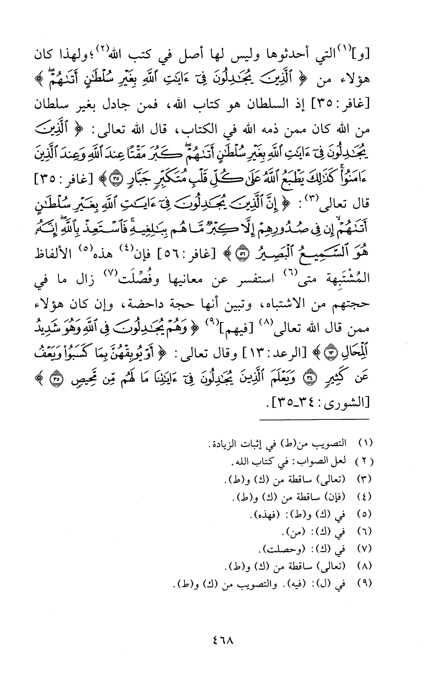 والتي أحدثوها وليس لها أصل في كتب الله ولهذا كان هؤلاء من الَّذِينَ يُجَادِلُونَ فِي آيَاتِ اللَّهِ بِغَيْرِ سُلْطَانٍ أَتَاهُمْ [غافر 35] إذ السلطان هو كتاب الله فمن جادل بغير سلطان من الله كان ممن ذمه الله في الكتاب قال الله تعالى الَّذِينَ يُجَادِلُونَ فِي آيَاتِ اللَّهِ بِغَيْرِ سُلْطَانٍ أَتَاهُمْ كَبُرَ مَقْتاً عِندَ اللَّهِ وَعِندَ الَّذِينَ آمَنُوا كَذَلِكَ يَطْبَعُ اللَّهُ عَلَى كُلِّ قَلْبِ مُتَكَبِّرٍ جَبَّارٍ {35} [غافر 35] قال تعالى إِنَّ الَّذِينَ يُجَادِلُونَ فِي آيَاتِ اللَّهِ بِغَيْرِ سُلْطَانٍ أَتَاهُمْ إِن فِي صُدُورِهِمْ إِلَّا كِبْرٌ مَّا هُم بِبَالِغِيهِ فَاسْتَعِذْ بِاللَّهِ إِنَّهُ هُوَ السَّمِيعُ الْبَصِيرُ {56} [غافر 56] فإن هذه الألفاظ المُشْتَبِهة متى استفسر عن معانيها وفُصِّلَت زال ما في حجتهم من الاشتباه وتبين أنها حجة داحضة وإن كان هؤلاء ممن قال الله تعالى فيهم وَهُمْ يُجَادِلُونَ فِي اللهِ وَهُوَ شَدِيدُ الْمِحَالِ {13} [الرعد 13] وقال تعالى أَوْ يُوبِقْهُنَّ بِمَا كَسَبُوا وَيَعْفُ عَن كَثِيرٍ {34} وَيَعْلَمَ الَّذِينَ يُجَادِلُونَ فِي آيَاتِنَا مَا لَهُم مِّن مَّحِيصٍ {35} [الشورى 34-35]