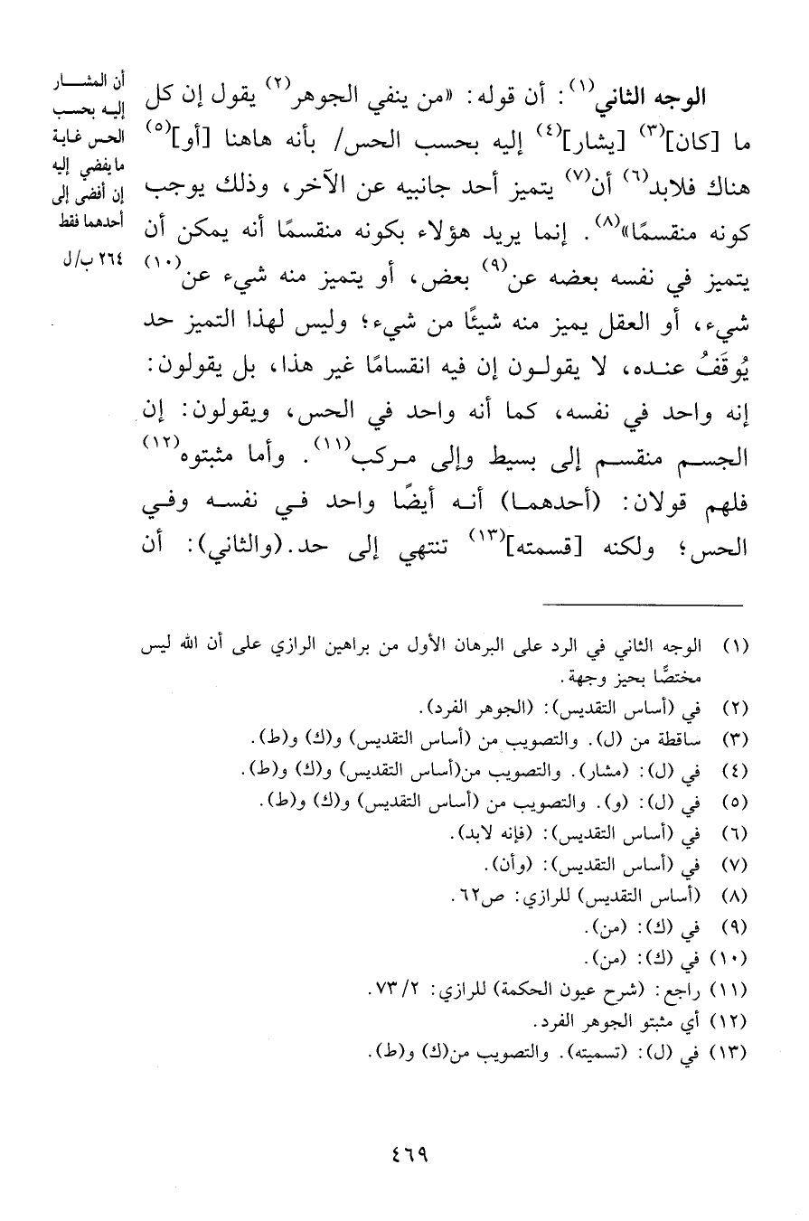 الوجه الثاني أن قوله من ينفي الجوهر يقول إن كل ما كان يشار إليه بحسب الحس بأنه هاهنا أو هناك فلابد لأن يتميز أحد جانبيه عن الآخر وذلك يوجب كونه منقسمًا إنما يريد هؤلاء بكونه منقسمًا أنه يمكن أن يتميز في نفسه بعضه عن بعض أو يتميز منه شيء عن شيء أو العقل يميز منه شيئًا من شيء وليس لهذا التميز حد يُوقَفُ عنده لا يقولون إن فيه انقسامًا غير هذا بل يقولون إنه واحد في نفسه كما أنه واحد في الحس ويقولون إن الجسم منقسم إلى بسيط وإلى مركب وأما مثبتوه فلهم قولان أحدهما أنه أيضًا واحد في نفسه وفي الحس ولكنه قسمته تنتهي إلى حد والثاني أن