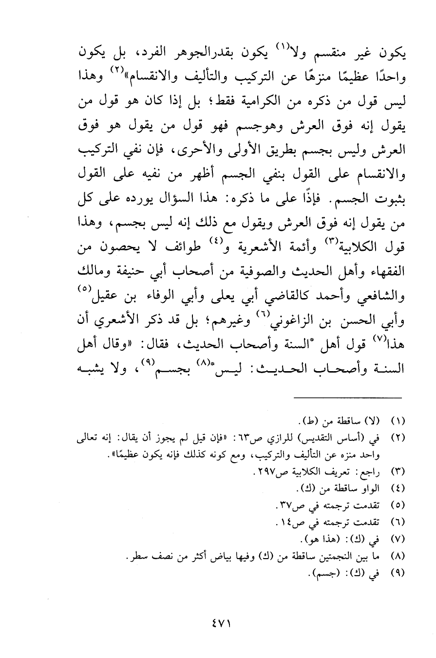يكون غير منقسم ولا يكون بقدرالجوهر الفرد بل يكون واحدًا عظيمًا منزهًا عن التركيب والتأليف والانقسام وهذا ليس قول من ذكره من الكرامية فقط بل إذا كان هو قول من يقول إنه فوق العرش وهوجسم فهو قول من يقول هو فوق العرش وليس بجسم بطريق الأولى والأحرى فإن نفي التركيب والانقسام على القول بنفي الجسم أظهر من نفيه على القول بثبوت الجسم فإذًا على ما ذكره هذا السؤال يورده على كل من يقول إنه فوق العرش ويقول مع ذلك إنه ليس بجسم وهذا قول الكلابية وأئمة الأشعرية وطوائف لا يحصون من الفقهاء وأهل الحديث والصوفية من أصحاب أبي حنيفة ومالك والشافعي وأحمد كالقاضي أبي يعلى وأبي الوفاء بن عقيل وأبي الحسن بن الزاغوني وغيرهم بل قد ذكر الأشعري أن هذا قول أهل السنة وأصحاب الحديث فقال وقال أهل السنة وأصحاب الحديث ليس بجسم ولا يشبه