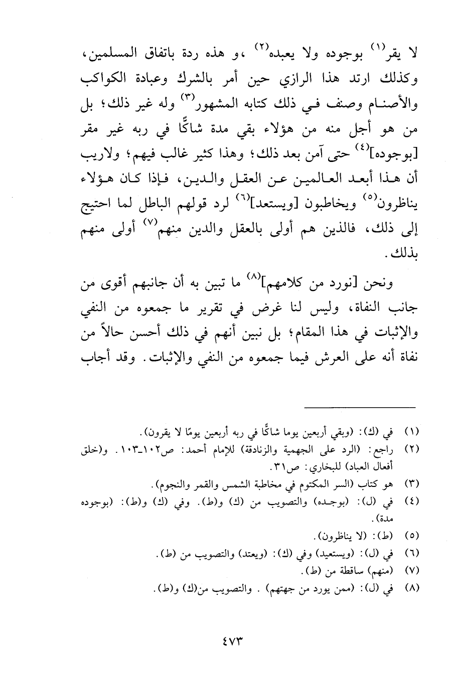 لا يقر بوجوده ولا يعبده وهذه ردة باتفاق المسلمين وكذلك ارتد هذا الرازي حين أمر بالشرك وعبادة الكواكب والأصنام وصنف في ذلك كتابه المشهور وله غير ذلك بل من هو أجل منه من هؤلاء بقي مدة شاكًّا في ربه غير مقر بوجوده حتى آمن بعد ذلك وهذا كثير غالب فيهم ولاريب أن هذا أبعد العالمين عن العقل والدين فإذا كان هؤلاء يناظرون ويخاطبون ويستعد لرد قولهم الباطل لما احتيج إلى ذلك فالذين هم أولى بالعقل والدين منهم أولى منهم بذلك ونحن نورد من كلامهم ما تبين به أن جانبهم أقوى من جانب النفاة وليس لنا غرض في تقرير ما جمعوه من النفي والإثبات في هذا المقام بل نبين أنهم في ذلك أحسن حالاً من نفاة أنه على العرش فيما جمعوه من النفي والإثبات وقد أجاب
