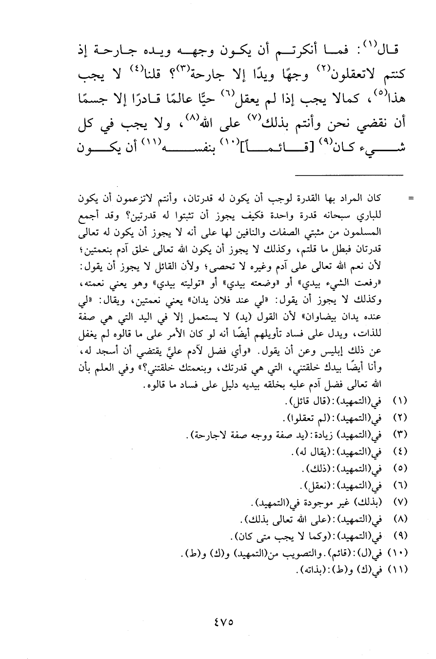 فما أنكرتم أن يكون وجهه ويده جارحة إذ كنتم لاتعقلون وجهًا ويدًا إلا جارحة قلنا لا يجب هذا كمالا يجب إذا لم يعقل حيًّا عالمًا قادرًا إلا جسمًا أن نقضي نحن وأنتم بذلك على الله ولا يجب في كل شيء كان قائماً بنفسه أن يكون