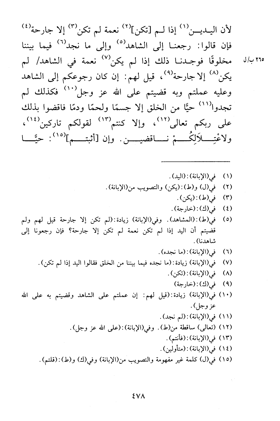 لأن اليدين إذا لم تكن نعمة لم تكن إلا جارحة فإن قالوا رجعنا إلى الشاهد وإلى ما نجد فيما بيننا مخلوقًا فوجدنا ذلك إذا لم يكن نعمة في الشاهد لم يكن إلا جارحة قيل لهم إن كان رجوعكم إلى الشاهد وعليه عملتم وبه قضيتم على الله عز وجل فكذلك لم تجدوا حيًّا من الخلق إلا جسمًا ولحمًا ودمًا فاقضوا بذلك على ربكم تعالى وإلا كنتم لقولكم تاركين ولاعْتِلاَلِكُمْ ناقضين وإن أثبتم حيًّا