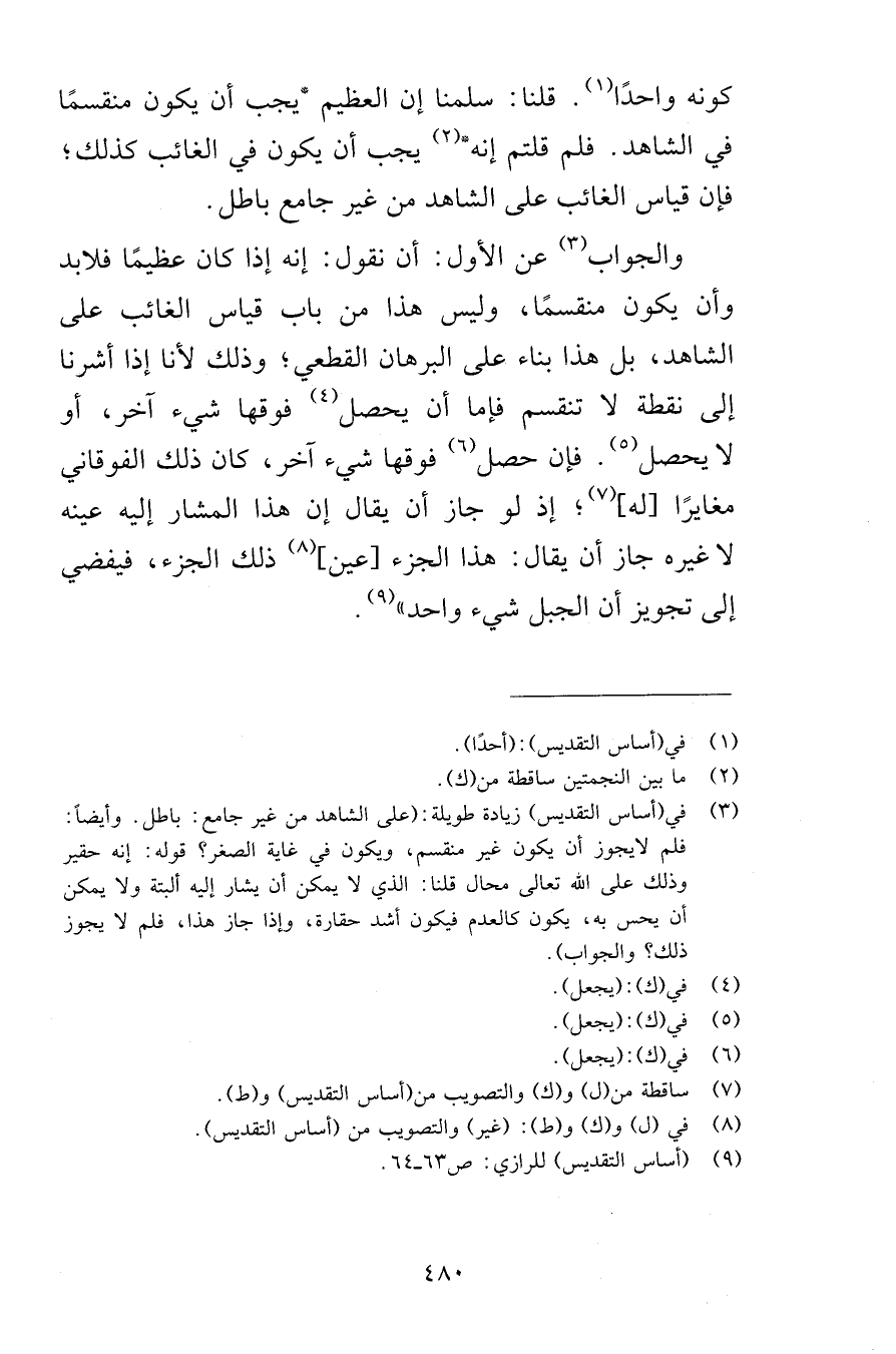 كونه واحدًا قلنا سلمنا أن العظيم يجب أن يكون منقسمًا في الشاهد فلم قلتم إنه يجب أن يكون في الغائب كذلك فإن قياس الغائب على الشاهد من غير جامع باطل والجواب عن الأول أن نقول إنه إذا كان عظيمًا فلابد وأن يكون منقسمًا وليس هذا من باب قياس الغائب على الشاهد بل هذا بناء على البرهان القطعي وذلك لأنا إذا أشرنا إلى نقطة لا تنقسم فإما أن يحصل فوقها شيء آخر أو لا يحصل فإن حصل فوقها شيء آخر كان ذلك الفوقاني مغايرًا له إذ لو جاز أن يقال إن هذا المشار إليه عينه لا غيره جاز أن يقال هذا الجزء عين ذلك الجزء فيفضي إلى تجويز أن الجبل شيء واحد