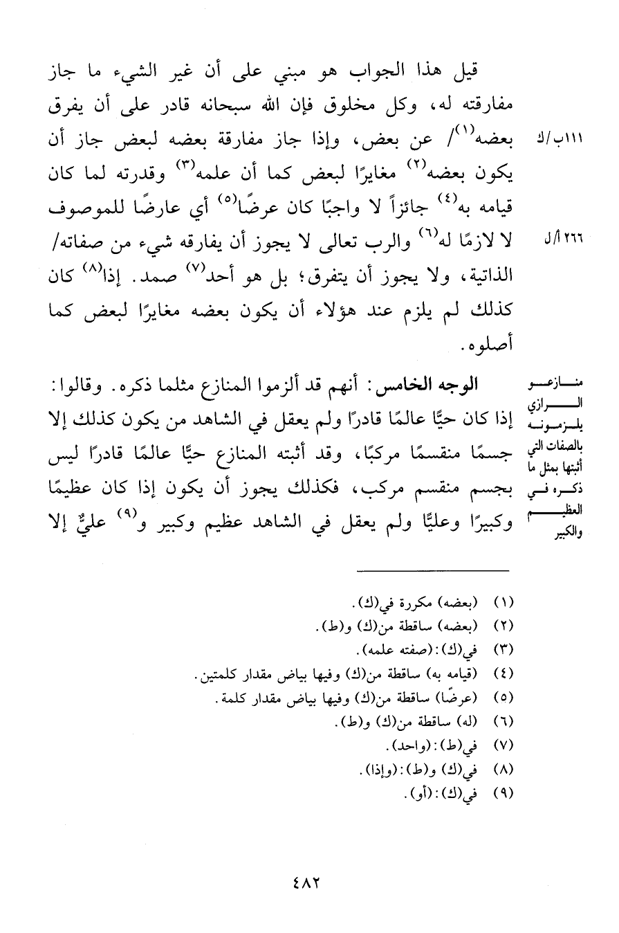قيل هذا الجواب هو مبني على أن غير الشيء ما جاز مفارقته له وكل مخلوق فإن الله سبحانه قادر على أن يفرق بعضه عن بعض وإذا جاز مفارقة بعضه لبعض جاز أن يكون بعضه مغايرًا لبعض كما أن علمه وقدرته لما كان قيام هبه جائزًا لا واجبًا كان عرضًا أي عارضًا للموصوف لا لازمًا له والرب تعالى لا يجوز أن يفارقه شيء من صفاته الذاتية ولا يجوز أن يتفرق بل هو أحد صمد إذا كان كذلك لم يلزم عند هؤلاء أن يكون بعضه مغايرًا لبعض كما أصلوه الوجه الخامس أنهم قد ألزموا المنازع مثلما ذكره وقالوا إذا كان حيًّا عالمًا قادرًا ولم يعقل في الشاهد من يكون كذلك إلا جسمًا منقسمًا مركبًا وقد أثبته المنازع حيًّا عالمًا قادرًا ليس بجسم منقسم مركب فكذلك يجوز أن يكون إذا كان عظيمًا وكبيرًا وعليًّا ولم يعقل في الشاهد عظيم وكبير وعليٌّ إلا