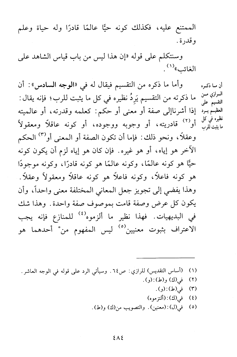 الممتنع عليه فكذلك كونه حيًّا عالمًا قادرًا وله حياة وعلم وقدرة وسنتكلم على قوله إن هذا ليس من باب قياس الشاهد على الغائب وأما ما ذكره من التقسيم فيقال له في الوجه السادس أن ما ذكرته من التقسيم يَرِدُ نظيره في كل ما يثبت للرب فإنه يقال إذا أشرناإلى صفة أو معنى أو حكم كعلمه وقدرته أو عالميته أو قادريته أو وجوبه ووجوده أو كونه عاقلاً ومعقولاً وعقلاً ونحو ذلك فإما أن تكون الصفة أو المعنى أو الحكم الآخر هو إياه أو هو غيره فإن كان هو إياه لزم أن يكون كونه حيًّا هو كونه عالمًا وكونه عالمًا هو كونه قادرًا وكونه موجودًا هو كونه فاعلاً وكونه فاعلاً هو كونه عاقلاً ومعقولاً وعقلاً وهذا يفضي إلى تجويز جعل المعاني المختلفة معنى واحدًا وأن يكون كل عرض وصفة قامت بموصوف صفة واحدة وهذا شك في البديهيات فهذا نظير ما ألزموه للمنازع فإنه يجب الاعتراف بثبوت معنيين ليس المفهوم من أحدهما هو