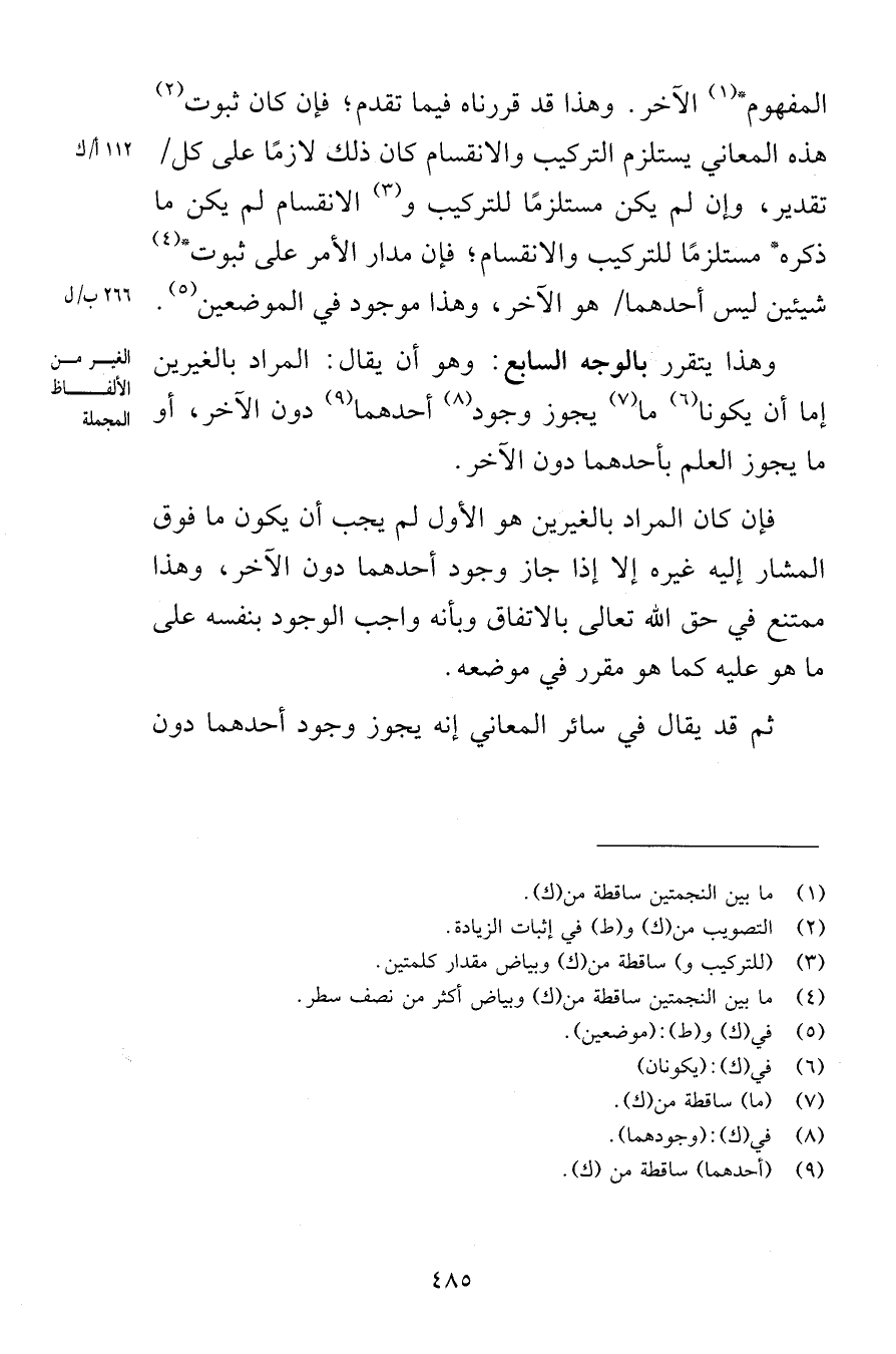 المفهوم الآخر وهذا قد قررناه فيما تقدم فإن كان ثبوت هذه المعاني يستلزم التركيب والانقسام كان ذلك لازمًا على كل تقدير وإن لم يكن مستلزمًا للتركيب والانقسام لم يكن ما ذكره مستلزمًا للتركيب والانقسام فإن مدار الأمر على ثبوت شيئين ليس أحدهما هو الآخر وهذا موجود في الموضعين وهذا يتقرر بالوجه السابع وهو أن يقال المراد بالغيرين إما أن يكون ما يجوز وجود أحدهما دون الآخر أو ما يجوز العلم بأحدهما دون الآخر فإن كان المراد بالغيرين هو الأول لم يجب أن يكون ما فوق المشار إليه غيره إلا إذا جاز وجود أحدهما دون الآخر وهذا ممتنع في حق الله تعالى بالاتفاق وبأنه واجب الوجود بنفسه على ما هو عليه كما هو مقرر في موضعه ثم قد يقال في سائر المعاني إنه يجوز وجود أحدهما دون