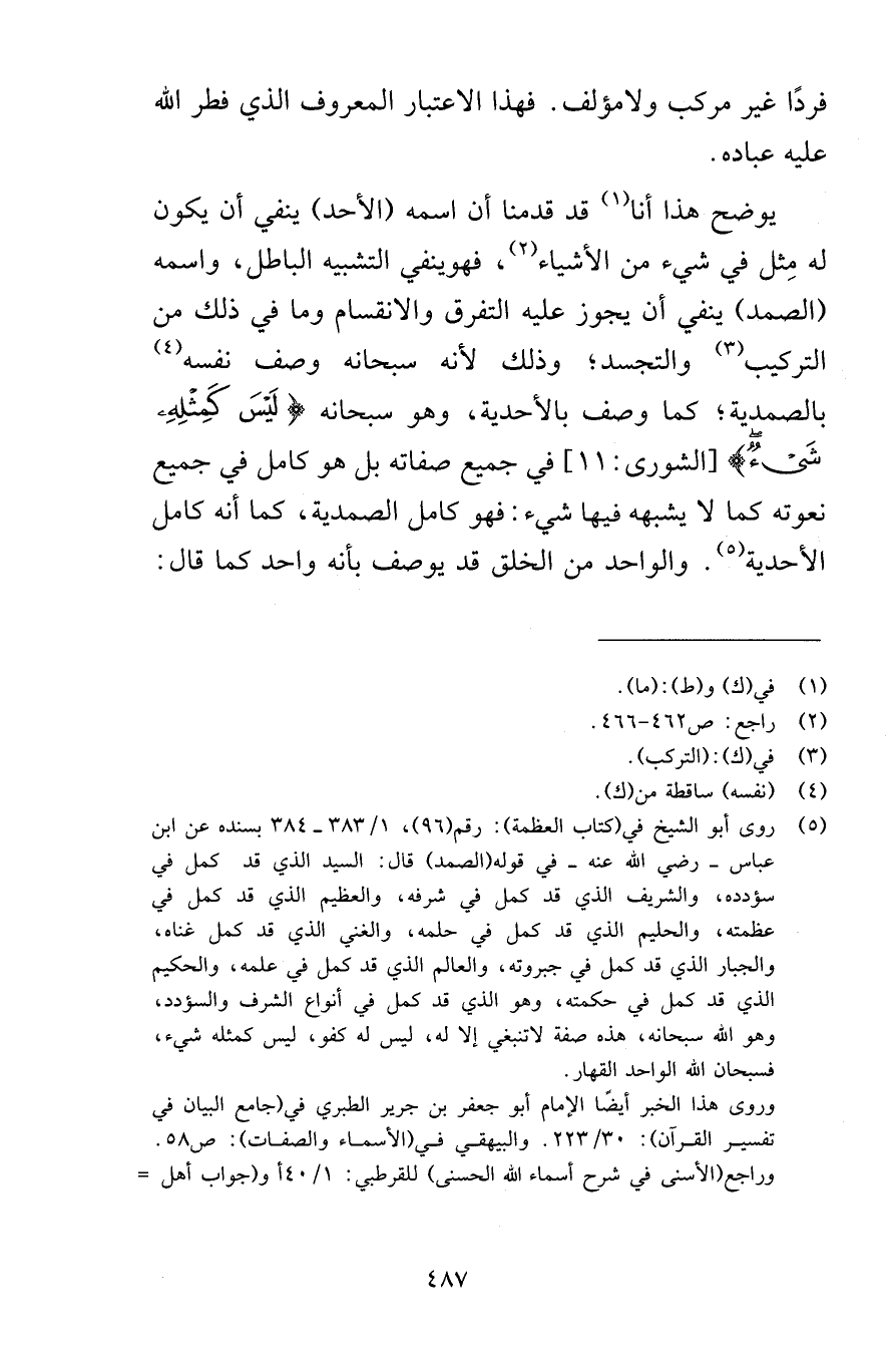 فردًا غير مركب ولا مؤلف فهذا الاعتبار المعروف الذي فطر الله عليه عباده يوضح هذا أنا قد قدمنا أن اسمه الأحد ينفي أن يكون له مِثل في شيء من الأشياء فهوينفي التشبيه الباطل واسمه الصمد ينفي أن يجوز عليه التفرق والانقسام وما في ذلك من التركيب والتجسيد وذلك لأنه سبحانه وصف نفسه بالصمدية كما وصف بالأحدية وهو سبحانه لَيْسَ كَمِثْلِهِ شَيْءٌ [الشورى 11] في جميع صفاته بل هو كامل في جميع نعوته كما لا يشبهه فيها شيء فهو كامل الصمدية كما أنه كامل الأحدية والواحد من الخلق قد يوصف بأنه واحد كما قال