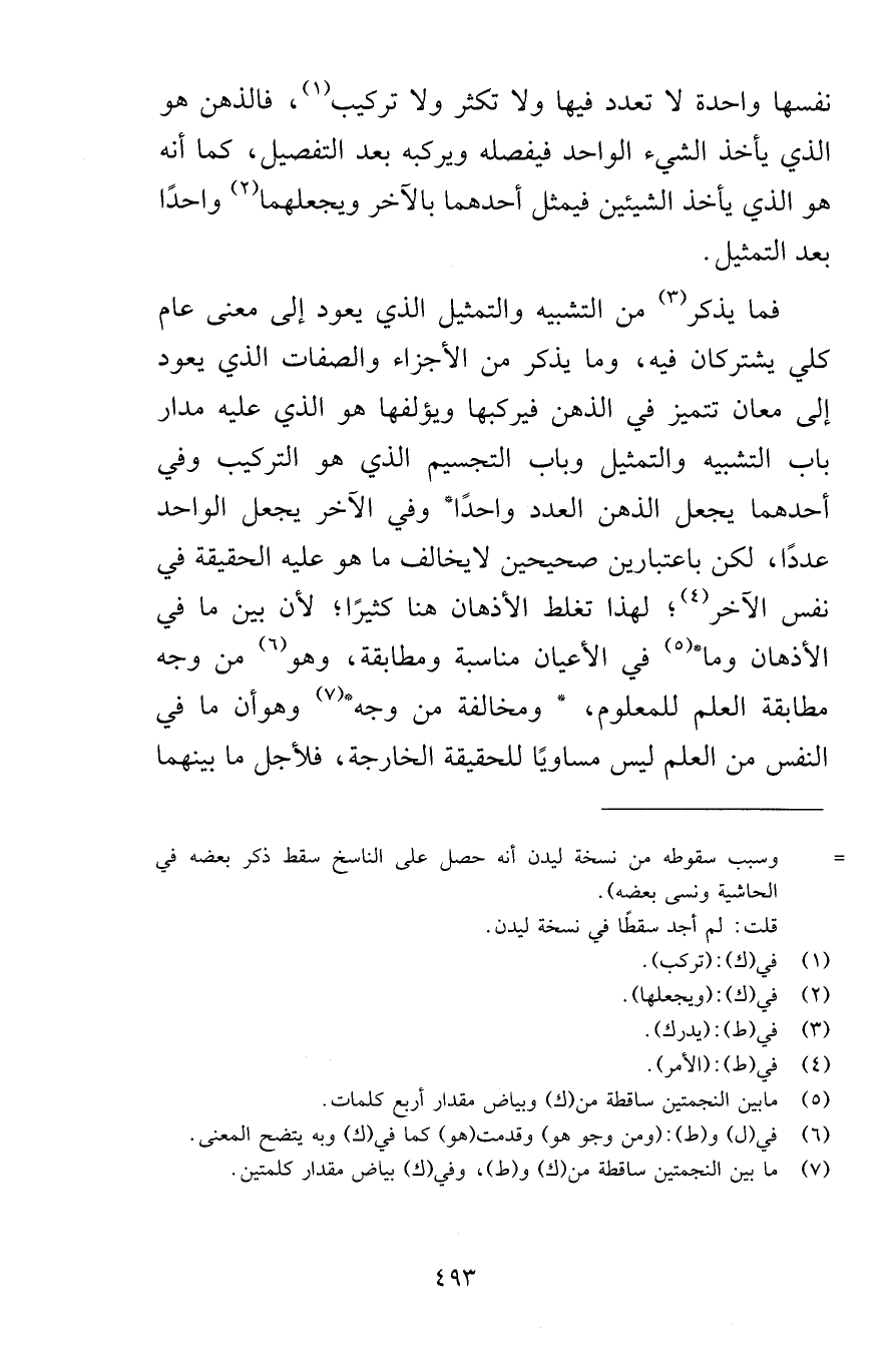 نفسها واحدة لا تعدد فيها ولا تكثر ولا تركيب فالذهن هو الذي يأخذ الشيء الواحد فيفصله ويركبه بعد التفصيل كما أنه هو الذي يأخذ الشيئين فيمثل أحدهما بالآخر ويجعلهما واحدًا بعد التمثيل فما يذكر من التشبيه والتمثيل الذي يعود إلى معنى عام كلي يشتركان فيه وما يذكر من الأجزاء والصفات الذي يعود إلى معان تتميز في الذهن فيركبها ويؤلفها هو الذي عليه مدار باب التشبيه والتمثيل وباب التجسيم الذي هو التركيب وفي أحدهما يجعل الذهن العدد واحدًا وفي الآخر يجعل الواحد عددًا لكن باعتبارين صحيحين لا يخالف ما هو عليه الحقيقة في نفس الآخر لهذا تغلط الأذهان هنا كثيرًا لأن بين ما في الأذهان وما في الأعيان مناسبة ومطابقة وهو من وجه مطابقة العلم للمعلوم ومخالفة من وجه وهوأن ما في النفس من العلم ليس مساويًا للحقيقة الخارجة فلأجل ما بينهما