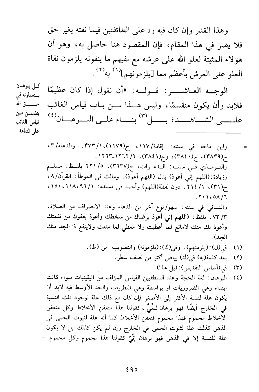 وهذا القدر وإن كان فيه رد على الطائفتين فيما نفته بغير حق فلا يضر في هذا المقام فإن المقصود هنا حاصل به وهو أن هؤلاء المثبتة لعلو الله على عرشه مع نفيهم ما ينفونه يلزمون نفاة العلو على العرش بأعظم مما يلزمونهم به الوجه العاشر قوله أن نقول إذا كان عظيمًا فلابد وأن يكون منقسمًا وليس هذا من باب قياس الغائب على الشاهد بل بناء على البرهان