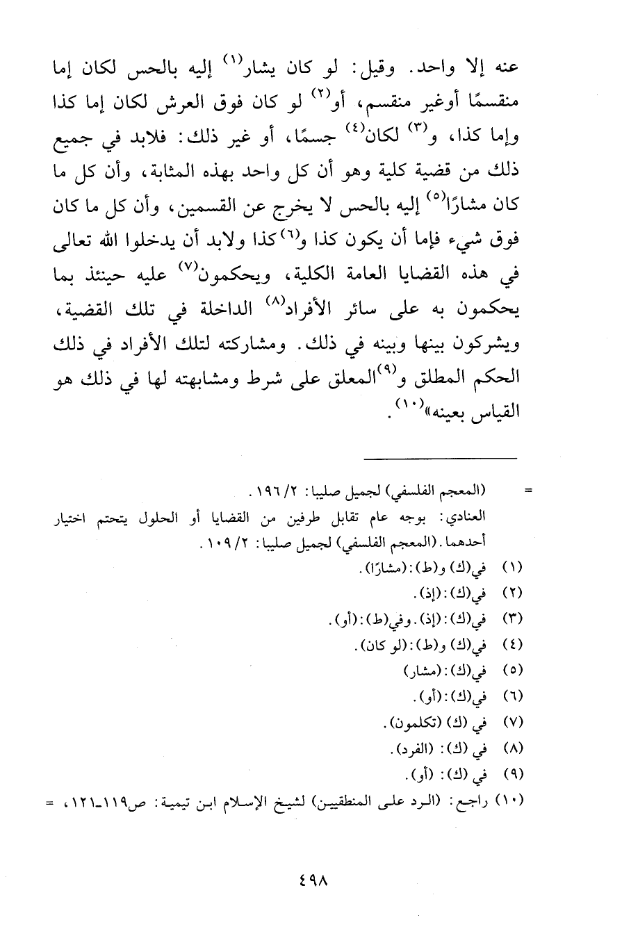 عنه إلا واحد وقيل لو كان يشار إليه بالحس لكان إما منقسمًا أو غير منقسم أو لو كان فوق العرش لكان إما كذا وإما كذا ولكان جسمًا أو غير ذلك فلابد في جميع ذلك من قضية كلية وهو أن كل واحد بهذه المثابة وأن كل ما كان مشارًا إليه بالحس لا يخرج عن القسمين وان كل ما كان فوق شيء فإما أن يكون كذا وكذا ولابد أن يدخلوا الله تعالى في هذه القضايا العامة الكلية ويحكمون عليه حينئذ بما يحكمون به على سائر الأفراد الداخلة في تلك القضية ويشركون بينها وبينه في ذلك ومشاركته لتلك الأفراد في ذلك الحكم المطلق والمعلق على شرط ومشابهته لها في ذلك هو القياس بعينه