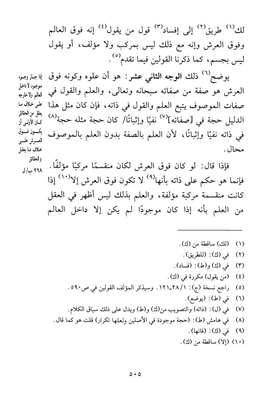 لك طريق إلى إفساد قول من يقول إنه فوق العالم وفوق العرش وإنه مع ذلك ليس بمركب ولا مؤلف أو يقول ليس بجسم كما ذكرنا القولين فيما تقدم يوضح ذلك الوجه الثاني عشر هو أن علوه وكونه فوق العرش هو صفة من صفاته سبحانه وتعالى والعلم والقول في صفات الموصوف يتبع العلم والقول في ذاته فإن كان مثل هذا الدليل حجة في صفاته نفيًا وإثباتًا كان حجة مثل حجة في ذاته نفيًا وإثباتًا لأن العلم بالصفة دون العلم بالموصوف محال فإذا قال لو كان فوق العرش لكان منقسمًا مركبًا مؤلفًا فإنما هو حكم على ذاته بأنها لا تكون فوق العرش إلا إذا كانت منقسمة مركبة مؤلفة والعلم بذلك ليس أظهر في العقل من العلم بأنه إذا كان موجودًا لم يكن إلا داخل العالم