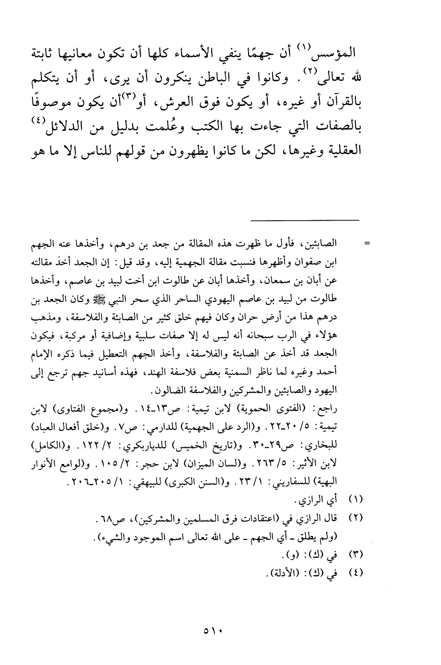 المؤسس أن جهمًا ينفي الأسماء كلها أن تكون معانيها ثابتة لله تعالى وكانوا في الباطن ينكرون أن يرى أو أن يتكلم بالقرآن أو غيره أو يكون فوق العرش أو أن يكون موصوفًا بالصفات التي جاءت بها الكتب وعُلمت بدليل من الدلائل العقلية وغيرها لكن ما كانوا يظهرون من قولهم للناس إلا ما هو