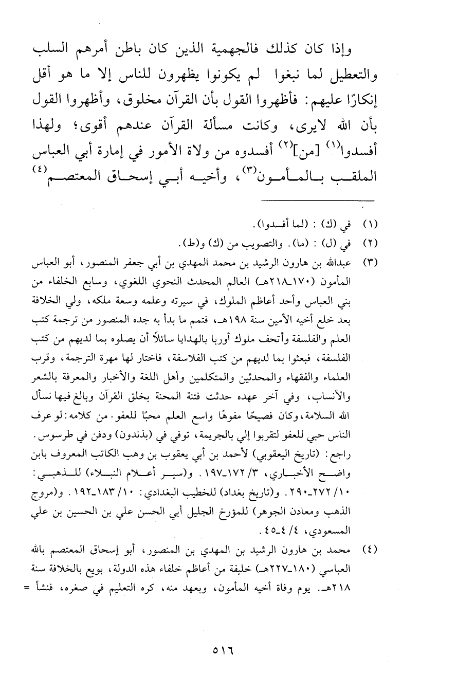 وإذا كان كذلك فالجهمية الذين كان باطن أمرهم السلب والتعطيل لما نبغوا لم يكونوا يظهرون للناس إلا ما هو أقل إنكارًا عليهم فأظهروا القول بأن القرآن مخلوق وأظهروا القول بأن الله لايرى وكانت مسألة القرآن عندهم أقوى ولهذا أفسدوا من أفسدوه من ولاة الأمور في إمارة أبي العباس الملقب بالمأمون وأخيه أبي إسحاق المعتصم