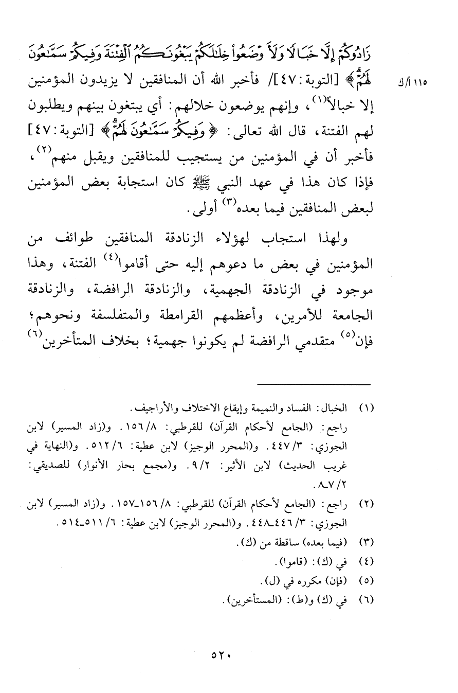 زَادُوكُمْ إِلاَّ خَبَالاً ولأَوْضَعُواْ خِلاَلَكُمْ يَبْغُونَكُمُ الْفِتْنَةَ وَفِيكُمْ سَمَّاعُونَ لَهُمْ [التوبة 47] فأخبر الله أن المنافقين لا يزيدون المؤمنين إلا خبالاً وإنهم يوضعون خلالهم أي يبتغون بينهم ويطلبون لهم الفتنة قال الله تعالى وَفِيكُمْ سَمَّاعُونَ لَهُمْ [التوبة 47] فأخبر أن في المؤمنين من يستجيب للمنافقين ويقبل منهم فإذا كان هذا في عهد النبي صلى الله عليه وسلم كان استجابة بعض المؤمنين لبعض المنافقين فيما بعده أولى ولهذا استجاب لهؤلاء الزنادقة المنافقين طوائف من المؤمنين في بعض ما دعوهم إليه حتى أقاموا الفتنة وهذا موجود في الزنادقة الجهمية والزنادقة الرافضة والزنادقة الجامعة للأمرين وأعظمهم القرامطة والمتفلسفة ونحوهم فإن متقدمي الرافضة لم يكونوا جهمية بخلاف المتأخرين