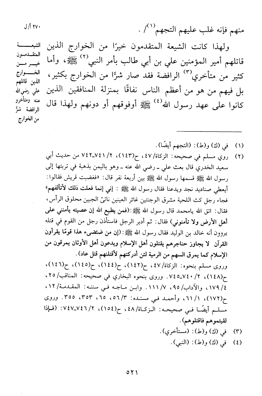 منهم فإنه غلب عليهم التجهم ولهذا كانت الشيعة المتقدمون خيرًا من الخوارج الذين قاتلهم أمير المؤمنين علي بن أبي طالب بأمر النبي صلى الله عليه وسلم وأما كثير من متأخري الرافضة فقد صار شرًّا من الخوارج بكثير بل فيهم من هو من أعظم الناس نفاقًا بمنزلة المنافقين الذين كانوا على عهد رسول الله صلى الله عليه وسلم أوفوقهم أو دونهم ولهذا قال